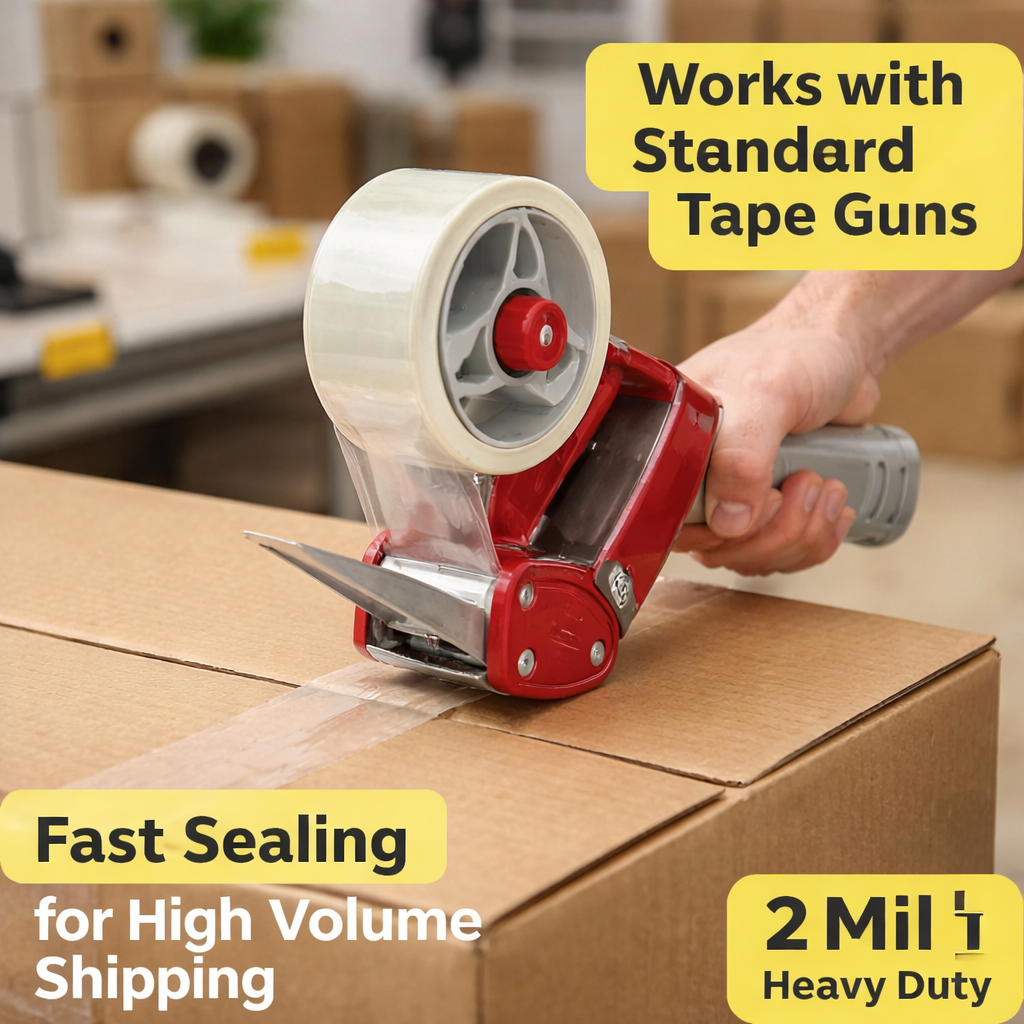12 Rolls - Clear Box Shipping Tape Color: Clear Width: 2" Thickness: 2.0 mil - considerably stronger than the cheaper 1.6mil Length: 110 Yards or 330 ft per roll Acrylic Tape - high performance - great in cold and hot climates Standard 3" core diameter - common size for most tape dispensers. Premium adhesive tensile strength High Shear Tape with Greater Holding Power Excellent for both industrial and home office / ecommerce applications Premium performance - resists breakage and seam splitting during application Package Includes: 12 Rolls of clear box sealing shipping packaging tape