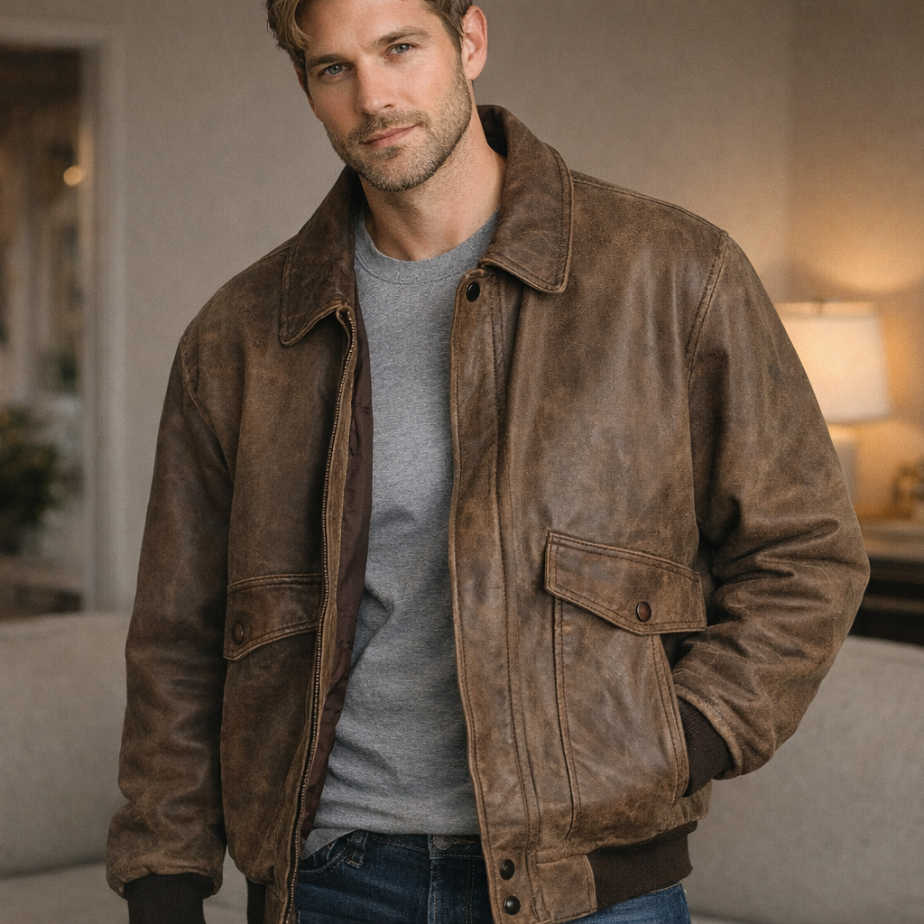 Rugged, classic Expedition men's jacket made from genuine leather in a versatile brown tone. Bomber-inspired styling with rib-knit cuffs/hem and roomy pockets—an easy everyday outer layer with a broken-in leather look.
