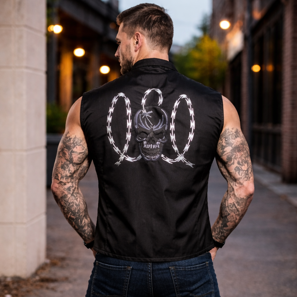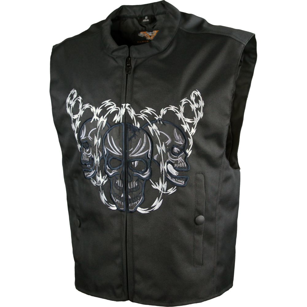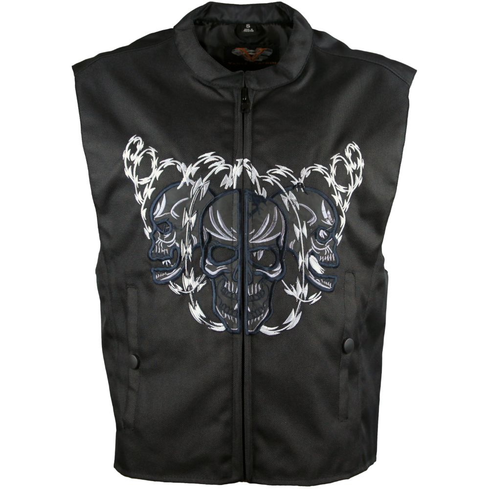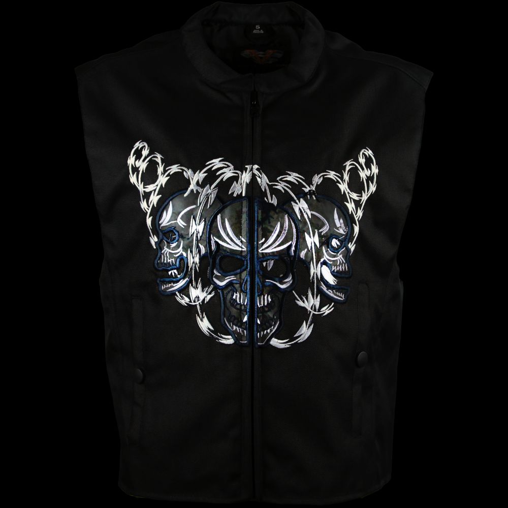 This men's textile vest features an embroidered skull with razor wire on the front and back. The embroidered portions are made reflective so may be seen better while riding at dusk or dark. The vest is complimented with an Euro collar and a zippered front. Perfect for the skull enthusiast or bike rider.