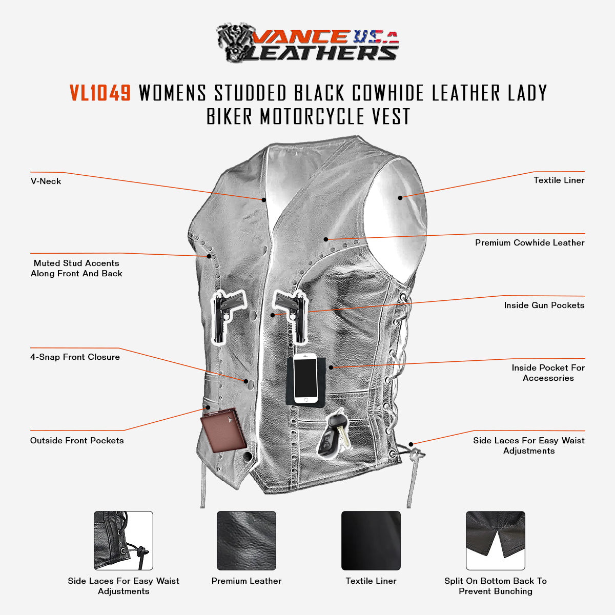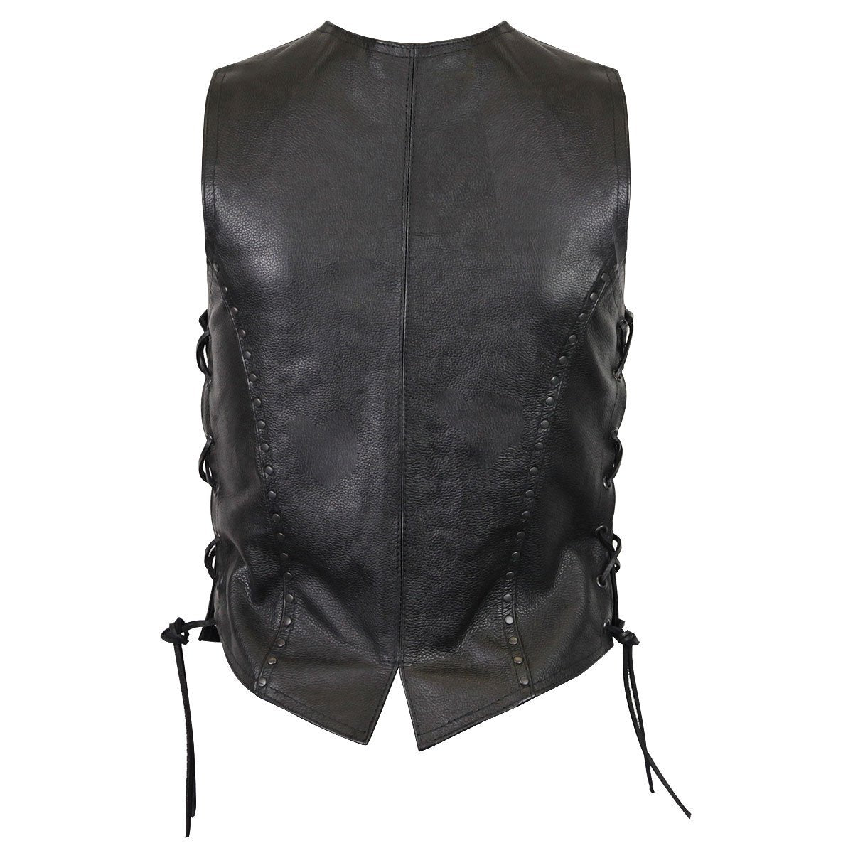 Ladies will love the Women\'s Black Leather Vest with Side Laces because of its simplicity. Beautiful leather with muted stud accents give this vest extra appeal. You also can\'t go wrong with integrated gun pockets built into the vest so lady riders can step out with ease.