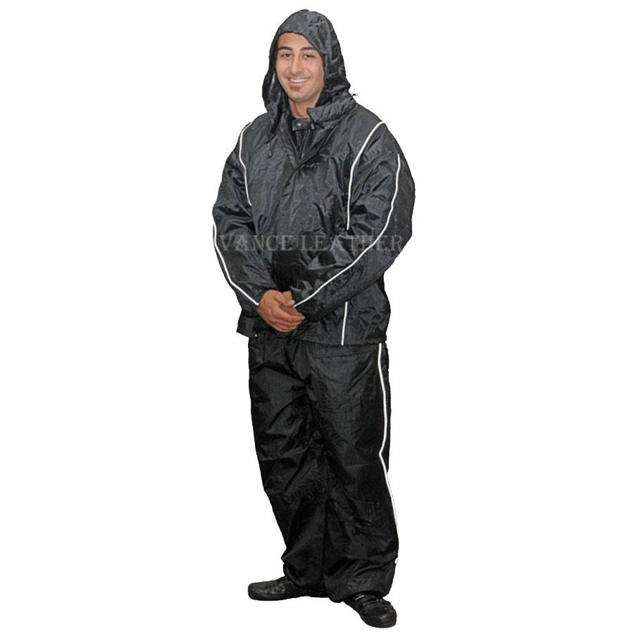 Unisex heavy duty rain suit, consisting of two pieces. The jacket has elastic cuffs to keep out rain, protective panels on the inner calf to resist heat, and a zipper compartment for the hood.