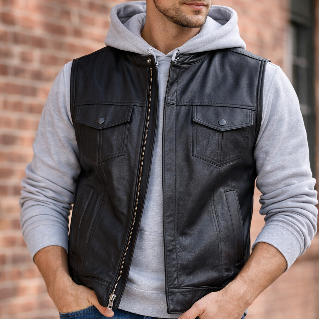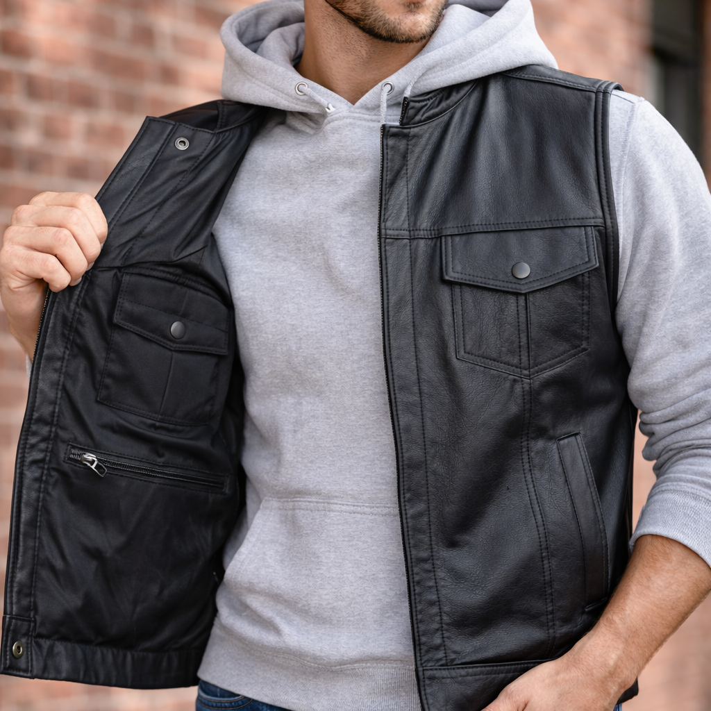 Built for the rider who wants clean club styling with real functionality. This black leather motorcycle vest delivers durability, comfort, and practical concealed carry storage in a timeless SOA-inspired design.