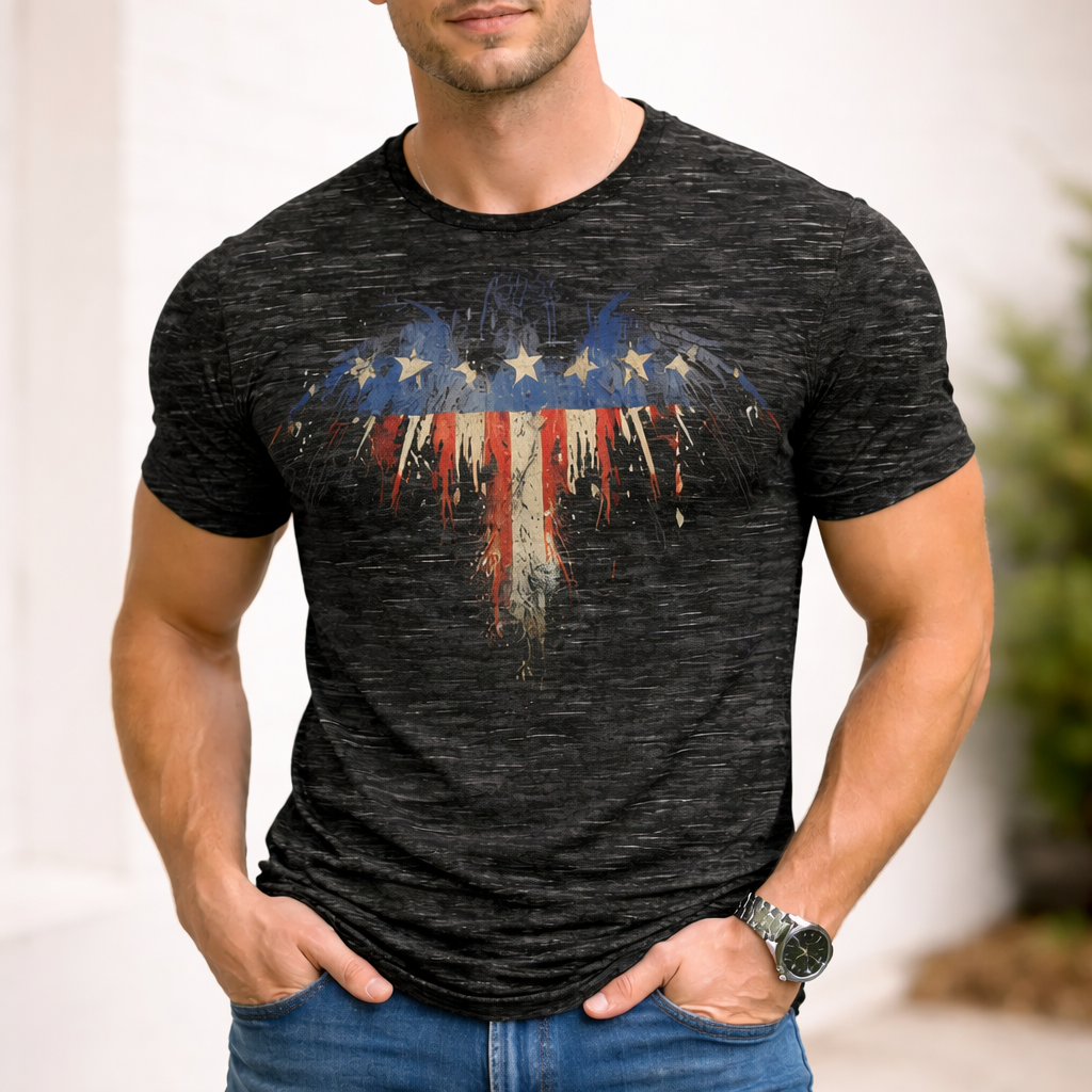 Show your patriotic style with this vintage-inspired American flag graphic tee. Featuring a distressed stars and stripes design in red, blue, and off-white tones on a heather black background.