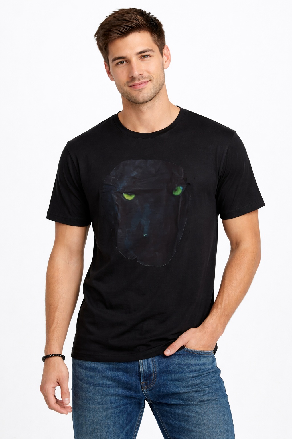 Black T-Shirt with a "Panther Eyes" sticker on the front