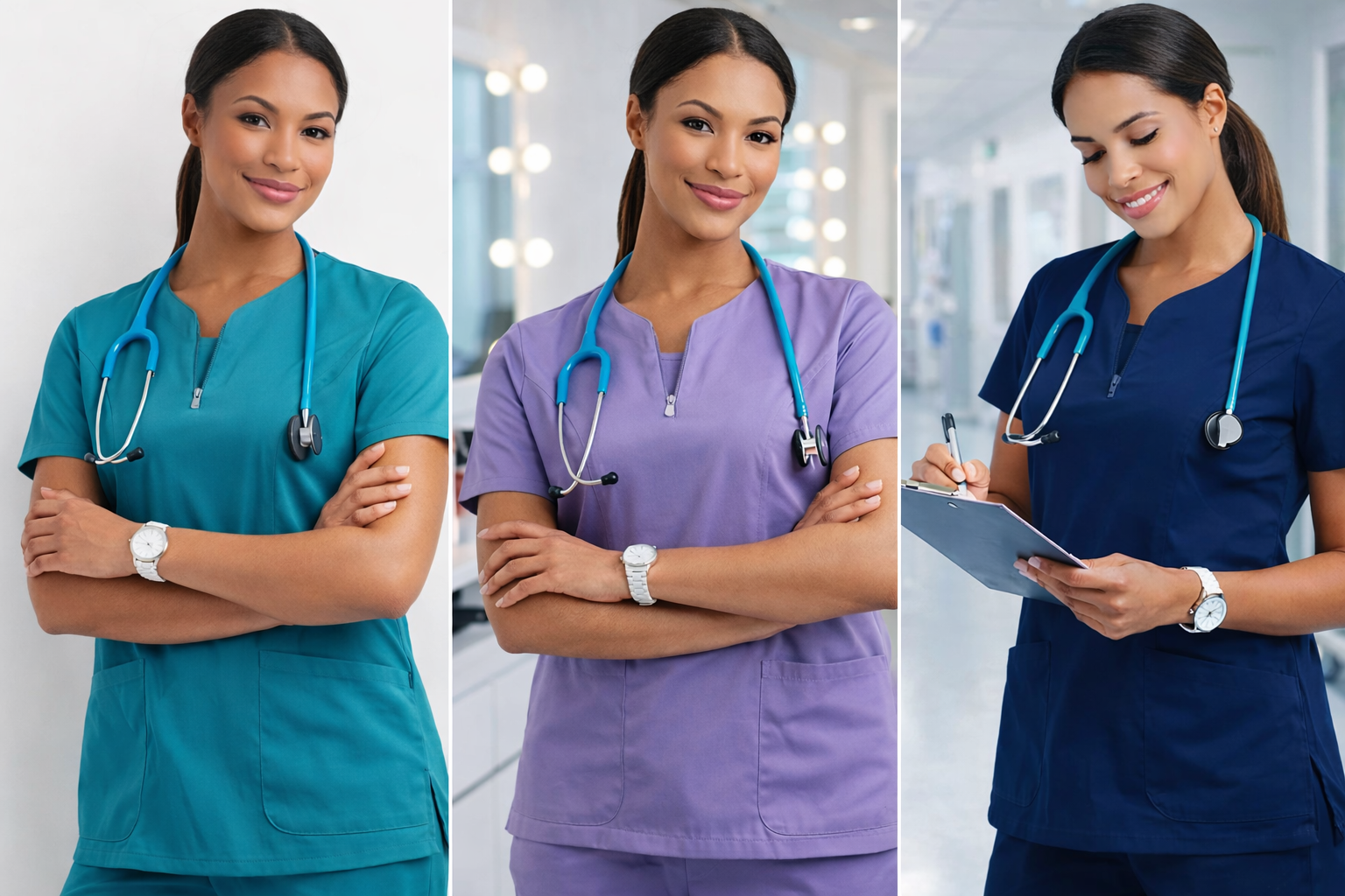 Medical Scrubs - Shirt onlyDesigned for healthcare workers but also popular with salon workers. Made for comfort with a neat look. 72% polyester, 6% Spandex, 22% rayon. Soft and breathable fabric, anti-pilling, friction resistant, moisture wicking, chlorine bleach resistant. Shirt has two large front pockets for pen, notepad etc. 6" wide x 6" deep, plus 2 side pockets for your hands. Neckline has a modesty coverage and a zipper. Short Sleeves. Popular with doctors, nurses, healthcare staff, pet care staff, research facilities, pharmacy staff, medical school, beauty salons and more ... Colors: Green, Blue, Light Purple - almost lavender |