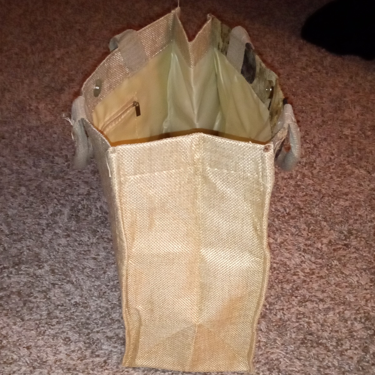 Pockets: One large compartment with a removable divider. Snap button at the top. Inside is a small zippered pocket for valuables.