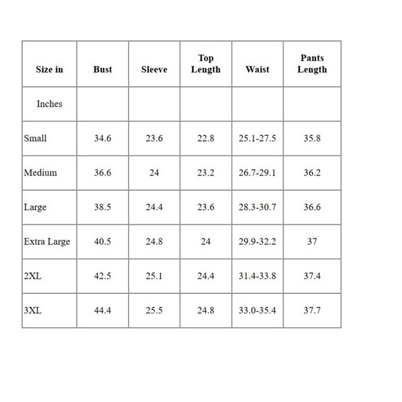 | Size in | Bust | Sleeve | Top Length | Waist | Pants Length |