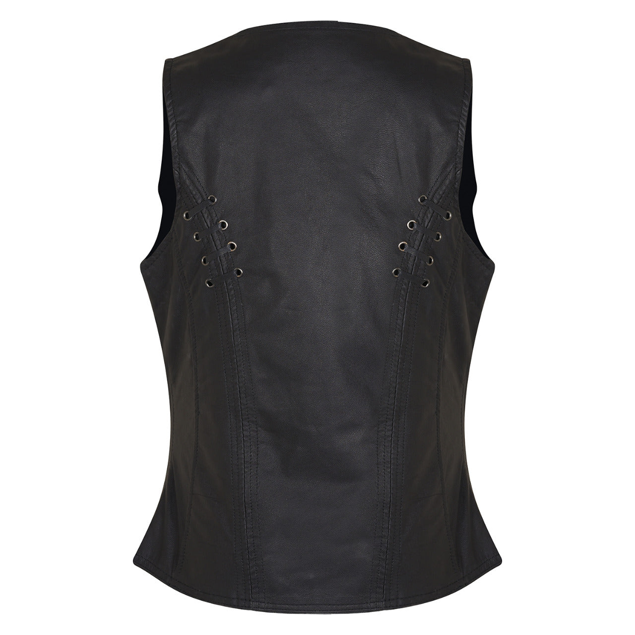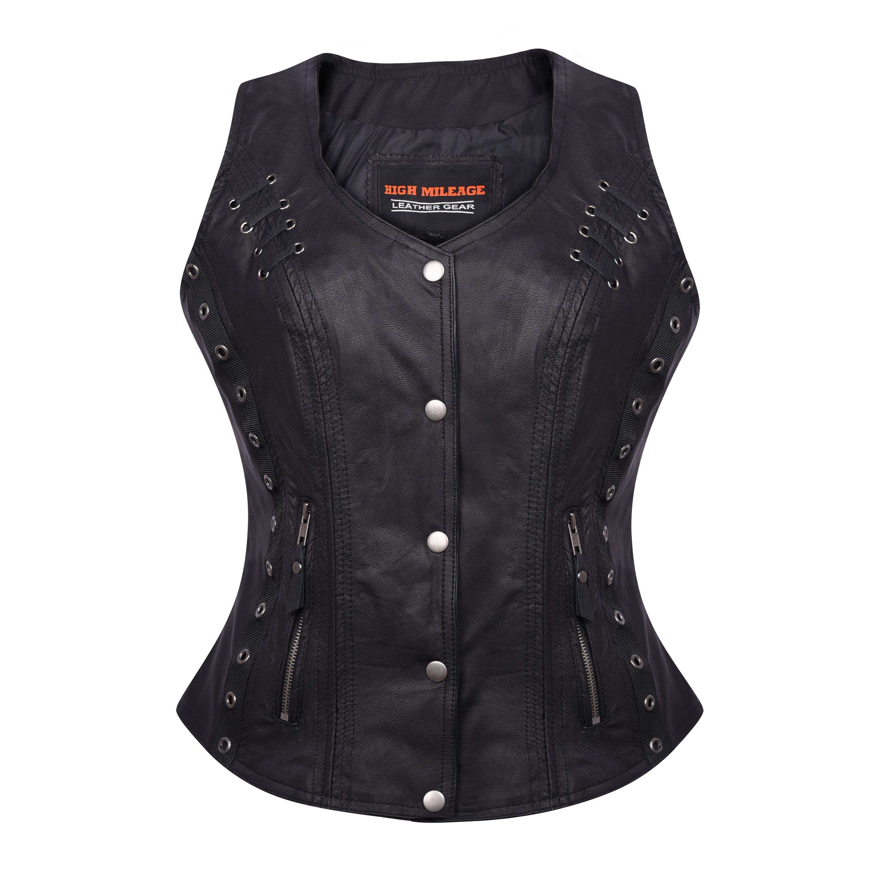 If you want a truly feminine look then try on the ladies lightweight naked goatskin leather vest. The vest is accented with black stitching which offsets the grommet details and lace accents. There is plenty of room for those little knick-knacks that the ladies love to carry. Also, this vest comes equipped with a gun pocket with elastic gun and ammunition fittings so she can step out well-protected and no one will be the wiser.