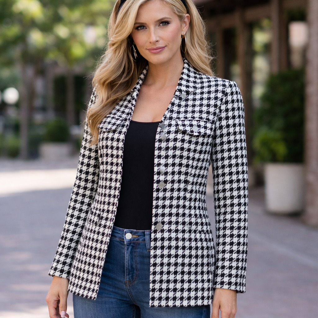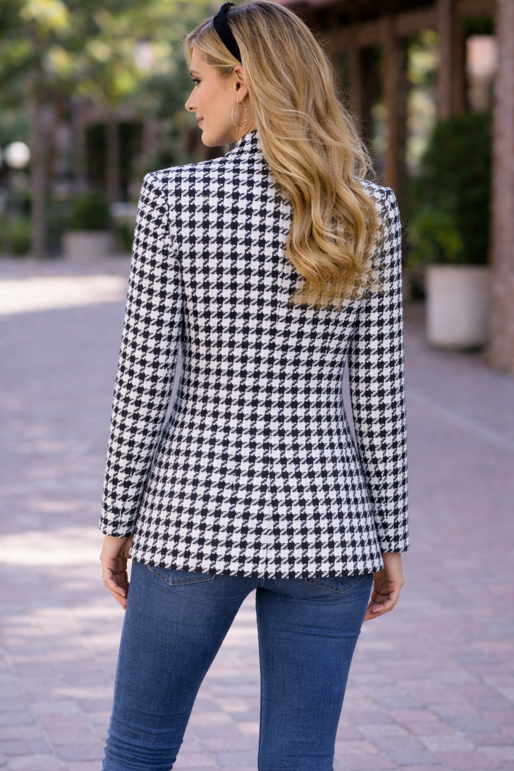 This classic black and white houndstooth blazer is a polished wardrobe staple with a refined, boutique-quality feel. Designed with a structured silhouette and tailored lines, it offers a flattering fit while remaining comfortable and easy to style.