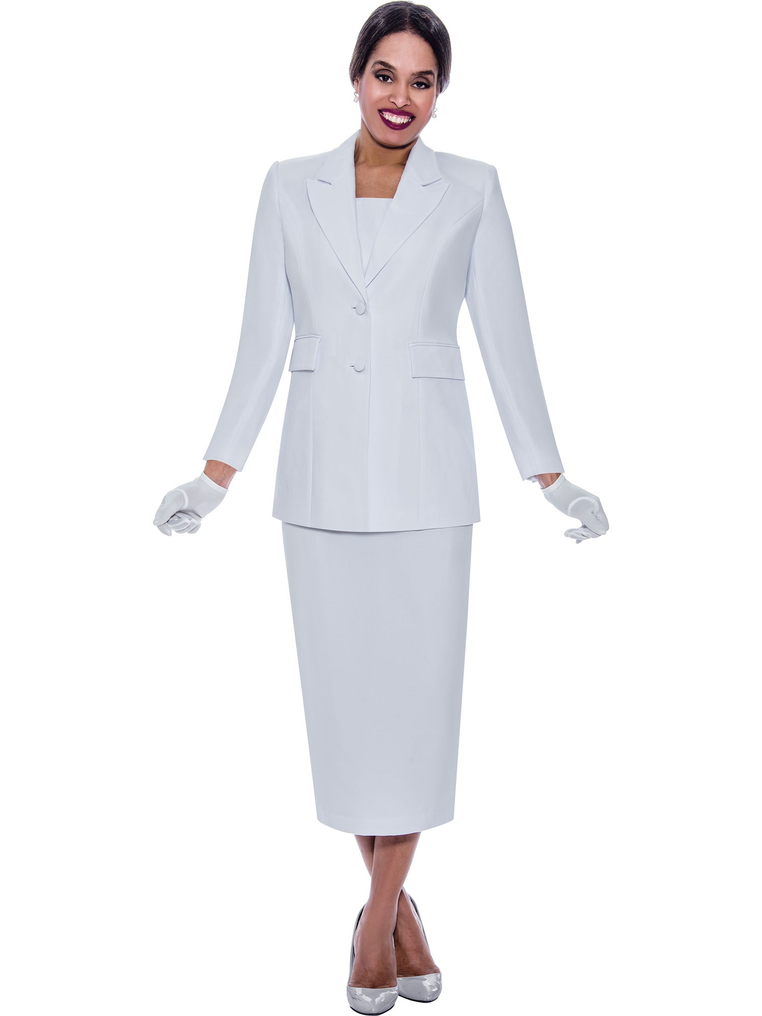 This is a classic two-piece women's suit ensemble, consisting of a tailored blazer and a matching skirt. The outfit features a structured, straight silhouette that offers a professional and elegant appearance.