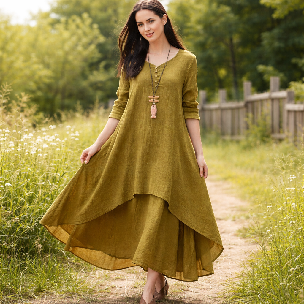 Double Layered Hem Maxi Dress, Relaxed fit - BOHO style - Olive