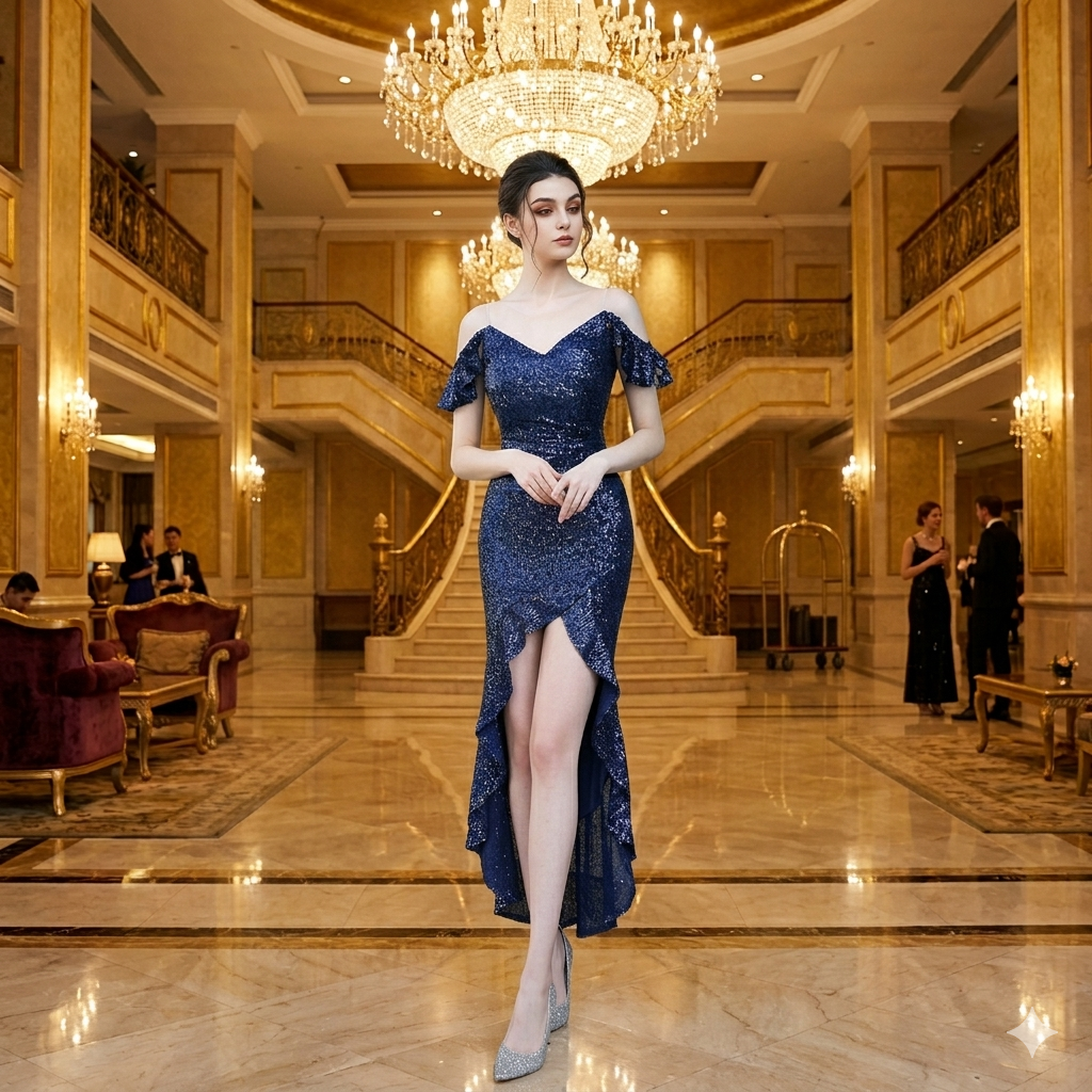 Dark Blue Sequined Hi-Low Fish Tail Dress
