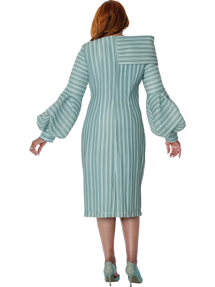 This sophisticated DCC green midi dress features slimming vertical stripes, dramatic puff sleeves, and an asymmetric draped neckline, finished with delicate floral bead embellishment for an elegant church, wedding, or special-occasion look.