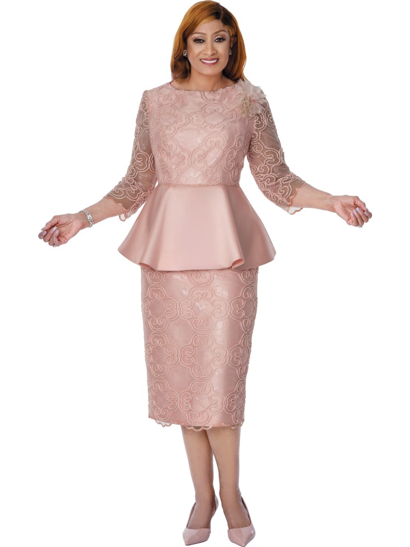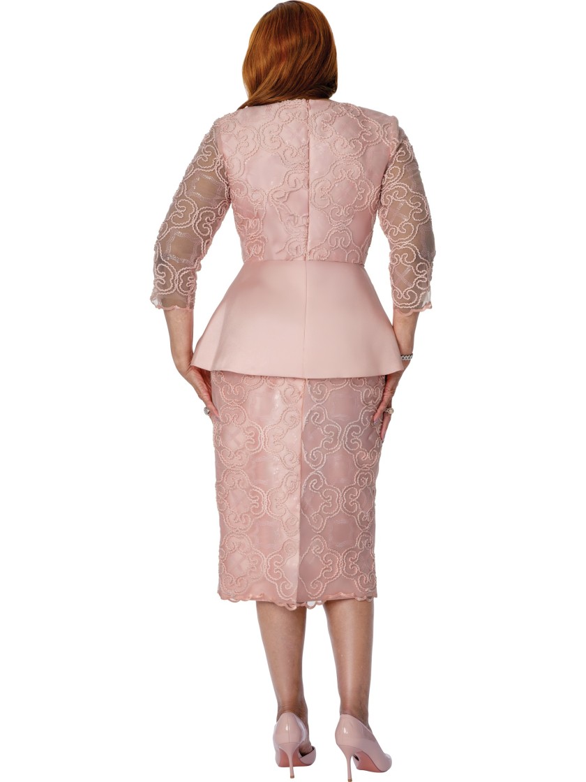 This refined DCC pink lace peplum skirt suit dress offers an elegant, modest look perfect for church and special occasions. The fitted lace skirt and peplum bodice flatter the figure, while the 3/4 sheer sleeves provide graceful coverage and comfort. A soft blush tone and delicate lace pattern add a feminine touch that suits weddings, services, and formal gatherings.