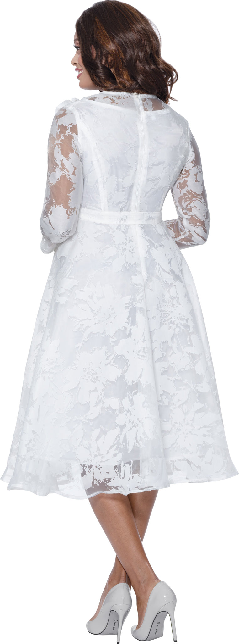 This elegant white midi dress features a delicate floral jacquard pattern with sheer long sleeves for a modest yet stylish look. It has a fitted bodice with a waist tie and a floral corsage detail on the shoulder, creating a graceful silhouette perfect for formal or church occasions.