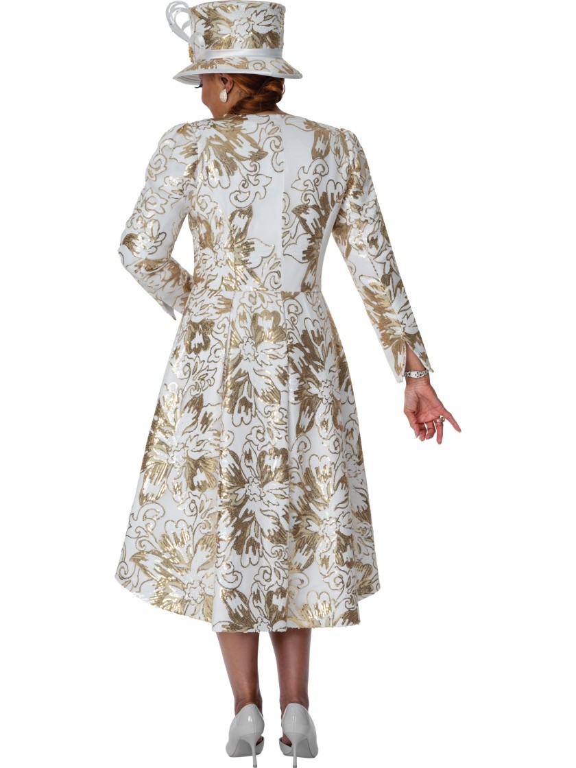 This elegant white and gold dress features a refined floral pattern with a graceful layered silhouette that adds movement and charm. Its jacket-style design and sophisticated detailing make it a beautiful choice for formal events and special occasions.