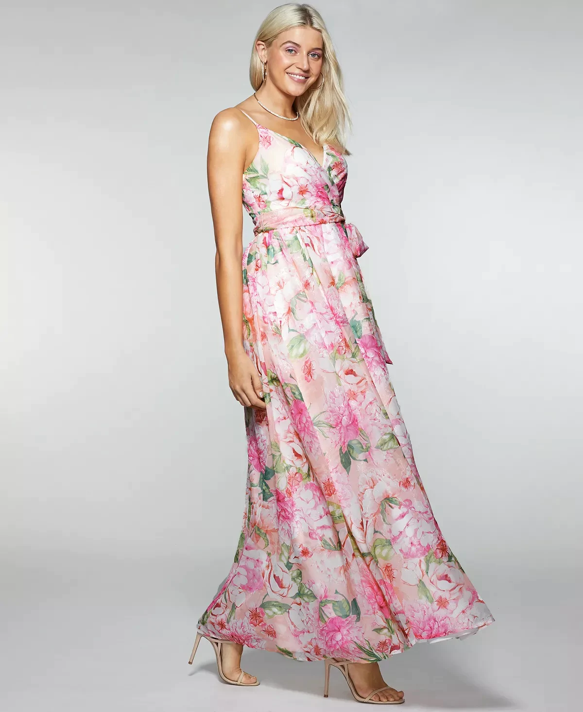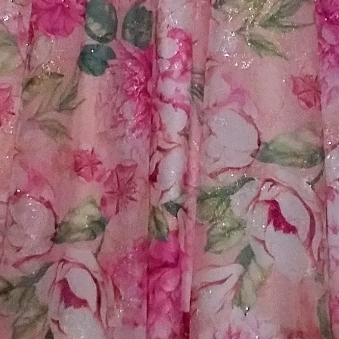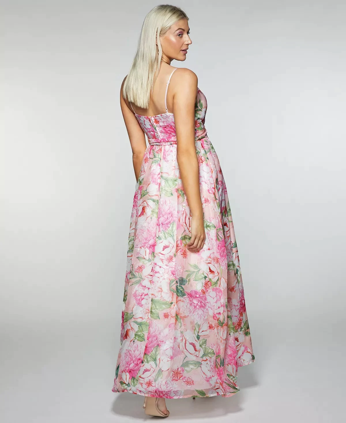 | Pattern Detail | Rhinestone-embellished metallic O-ring detail at side waist of belt; allover floral print with glitter detail |