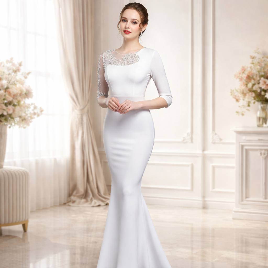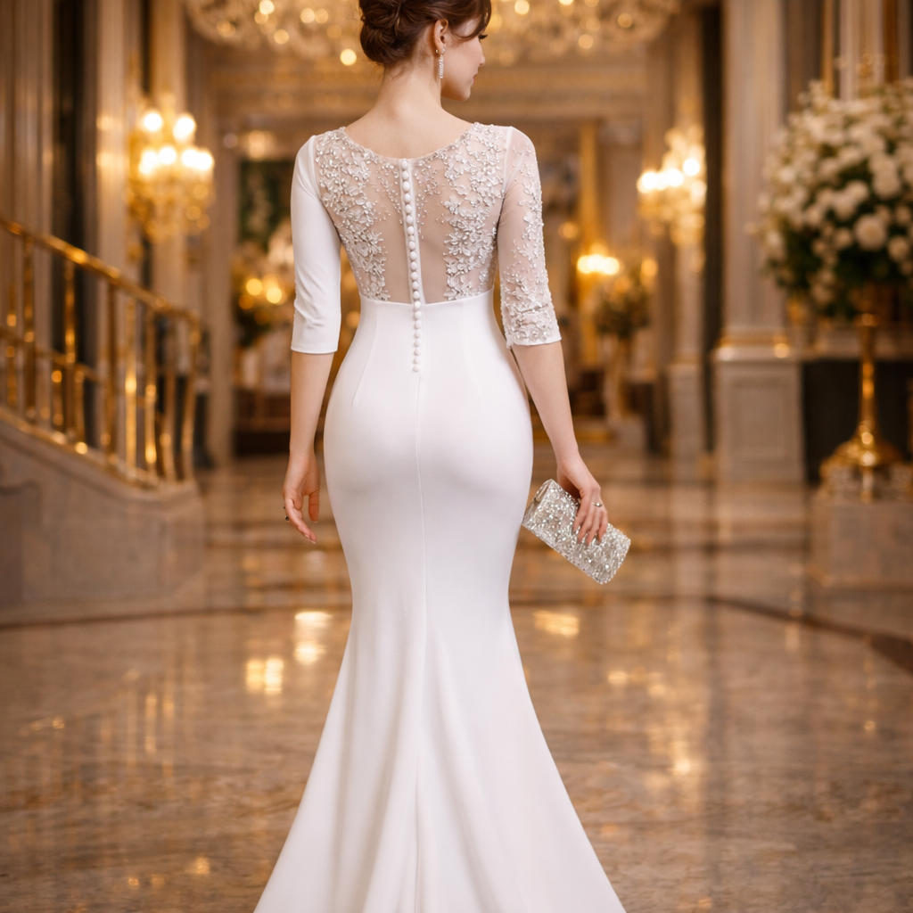 A refined and elegant evening gown designed for unforgettable occasions. This beautiful white formal dress features a sleek silhouette that gently follows the natural curves of the body before flowing into a graceful half-trumpet hem. Delicate lace appliqué and crystal embellishments add subtle sparkle, giving the gown a luxurious and sophisticated look.
