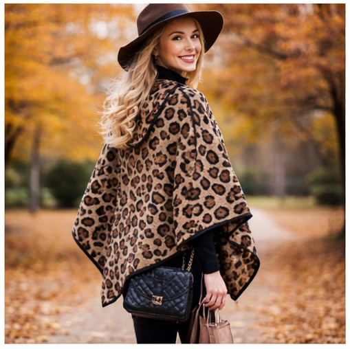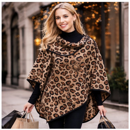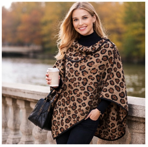 Designer statement poncho with a classic leopard print and an easy buttoned collar. Effortless “throw-on-and-go” warmth for office, travel, and everyday style.