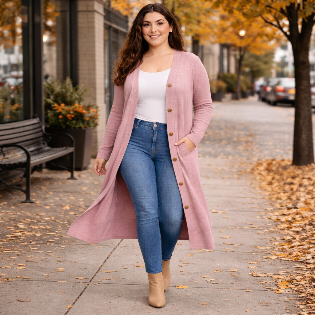 Flattering, comfortable, and easy to layer — this women’s plus-size long cardigan duster is designed to drape smoothly without clinging. The ribbed knit and button front create a slimming vertical look that works for everyday wear, work, or travel.
