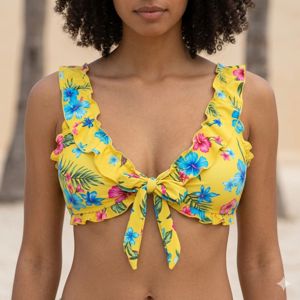 Bright, flirty tropical swim top with feminine ruffle straps and tie-front detail.
