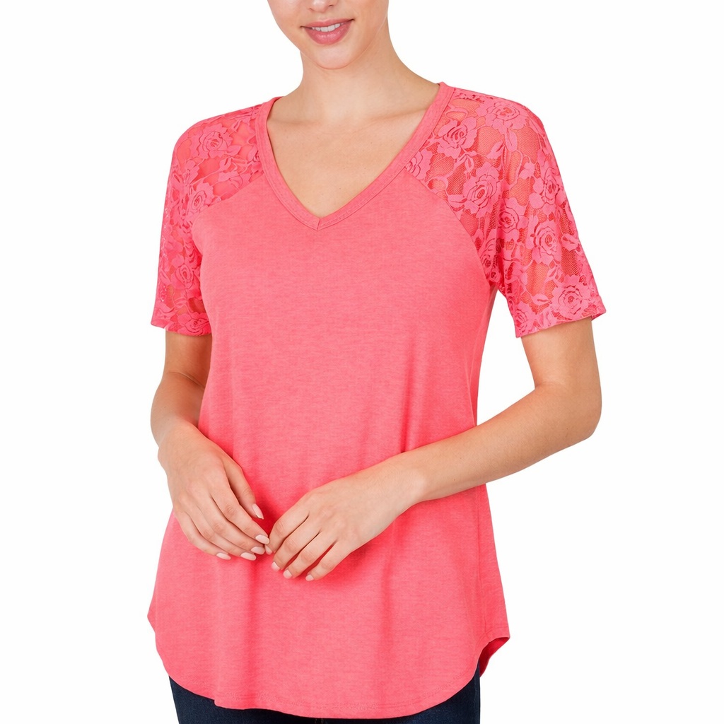 V-Neck Short Sleeve Round Hem N Coral Pink