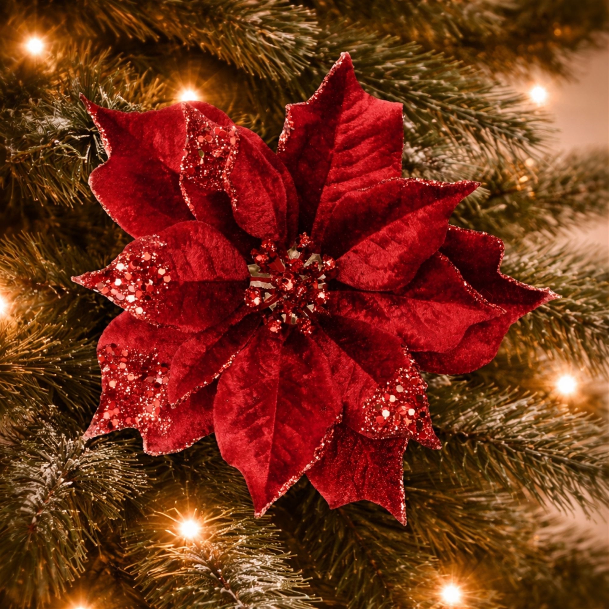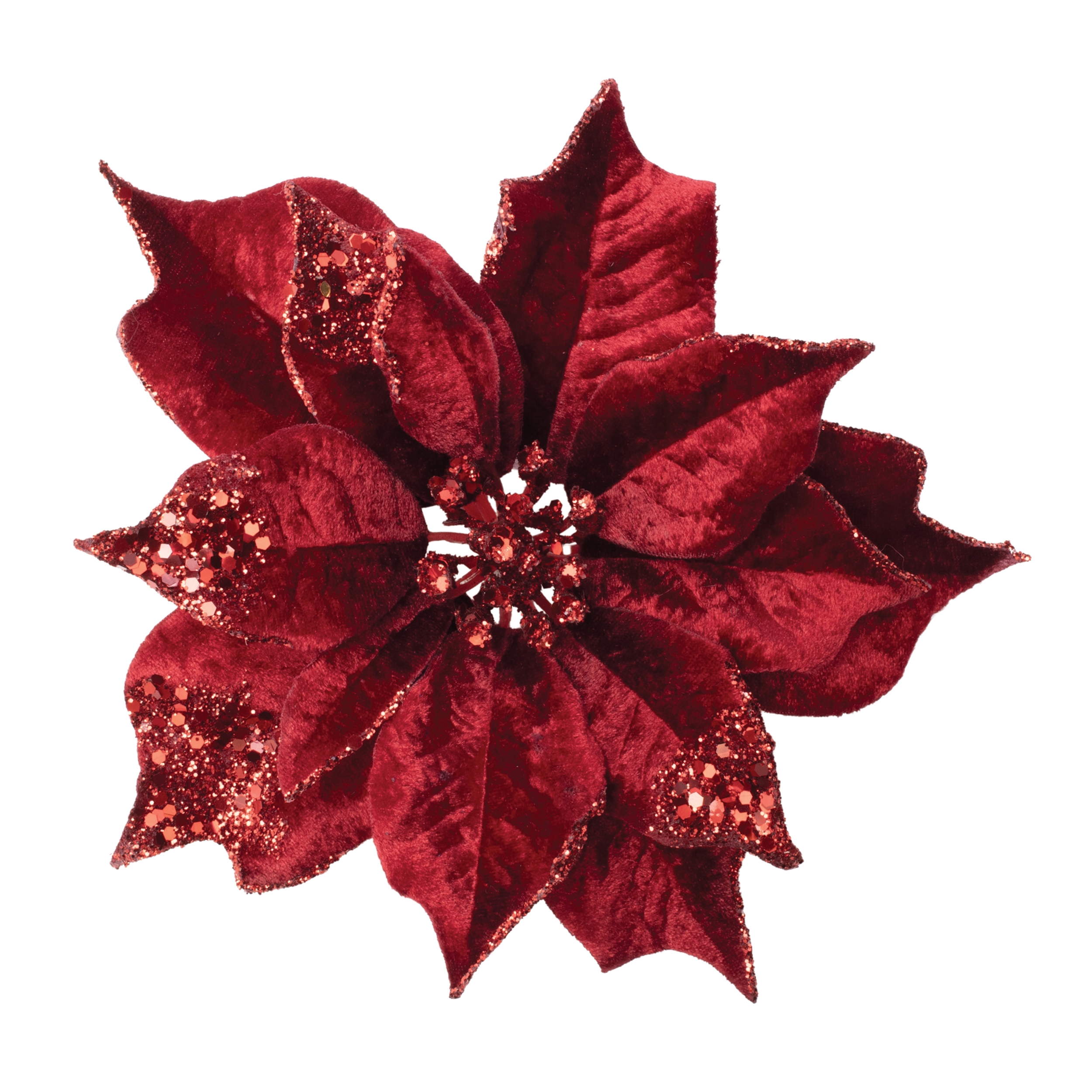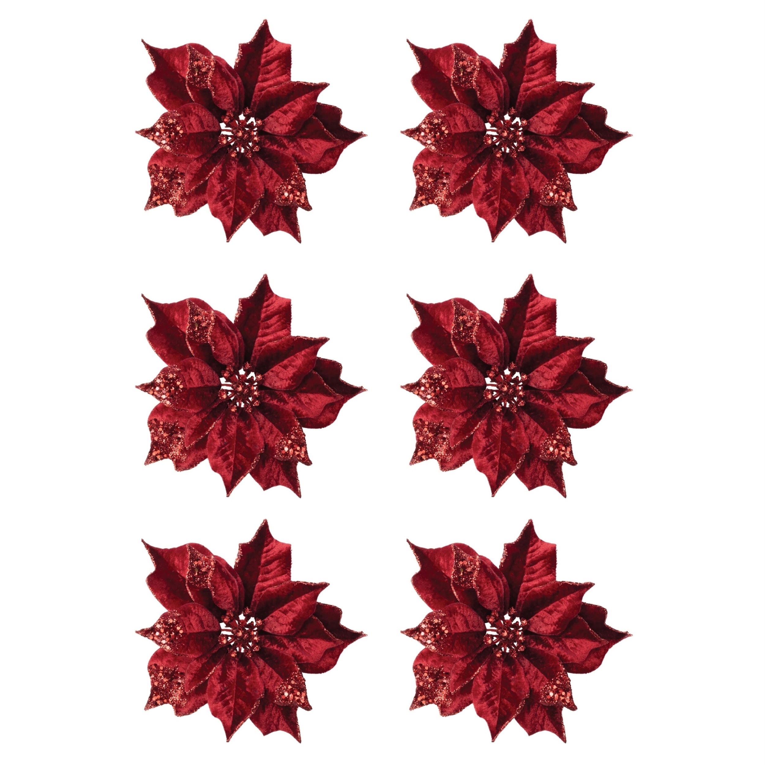 - Set of six velvet-look poinsettia clips with glittered petal edges and a detailed decorative center for added holiday shimmer