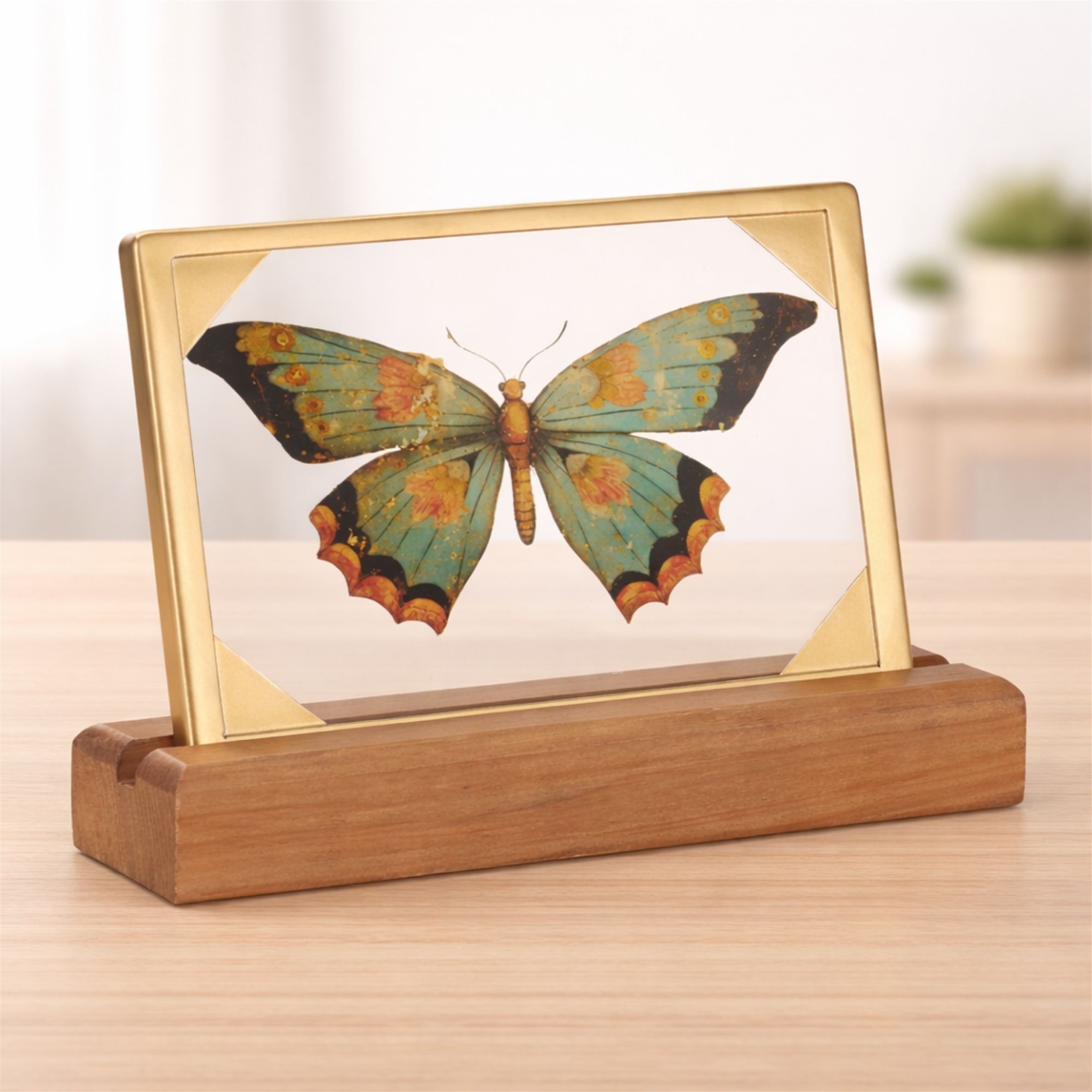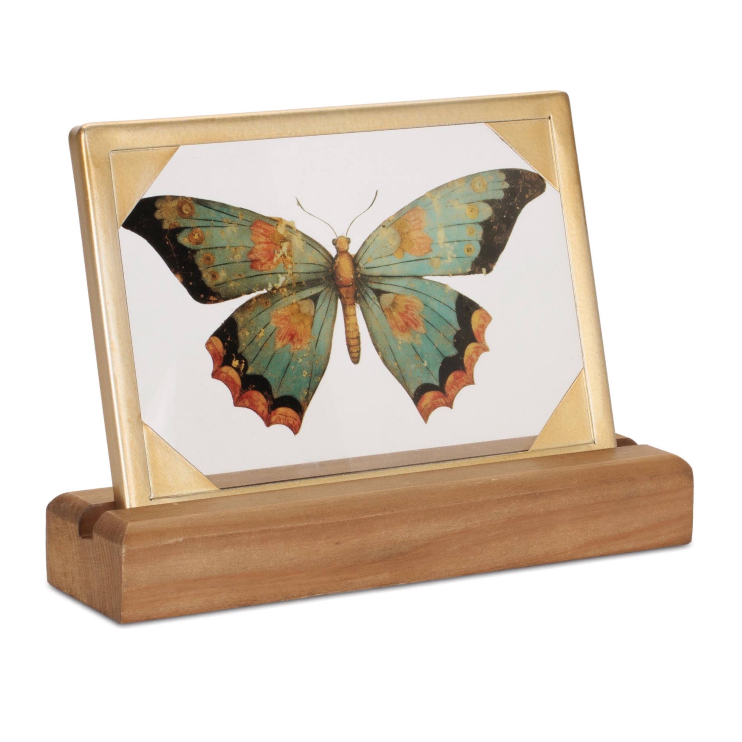 - Delicate and timeless, this framed butterfly tabletop decor piece brings a touch of natural beauty to any space. Featuring a cool-toned butterfly illustration set within a sleek glass panel and accented by a metallic frame, it creates an elegant focal point for desks, bookshelves, mantels, or entryway tables. The wood base adds organic warmth, making it easy to blend with modern, vintage, or eclectic decor styles. Whether styled alone or layered with other decorative accents, this butterfly art piece adds charm, sophistication, and a subtle nod to nature-inspired design.
