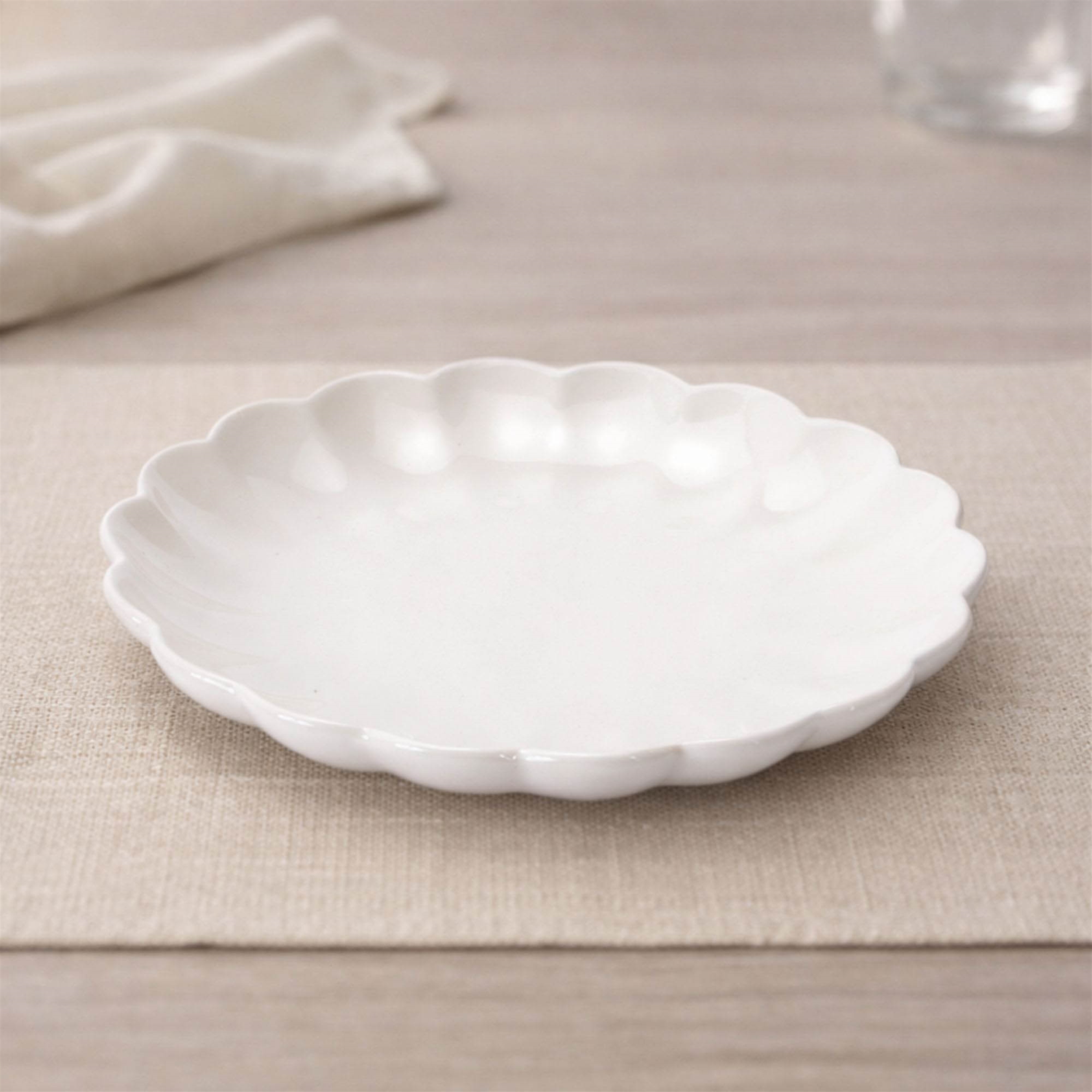 - Features a sculpted scalloped edge with a smooth glazed finish