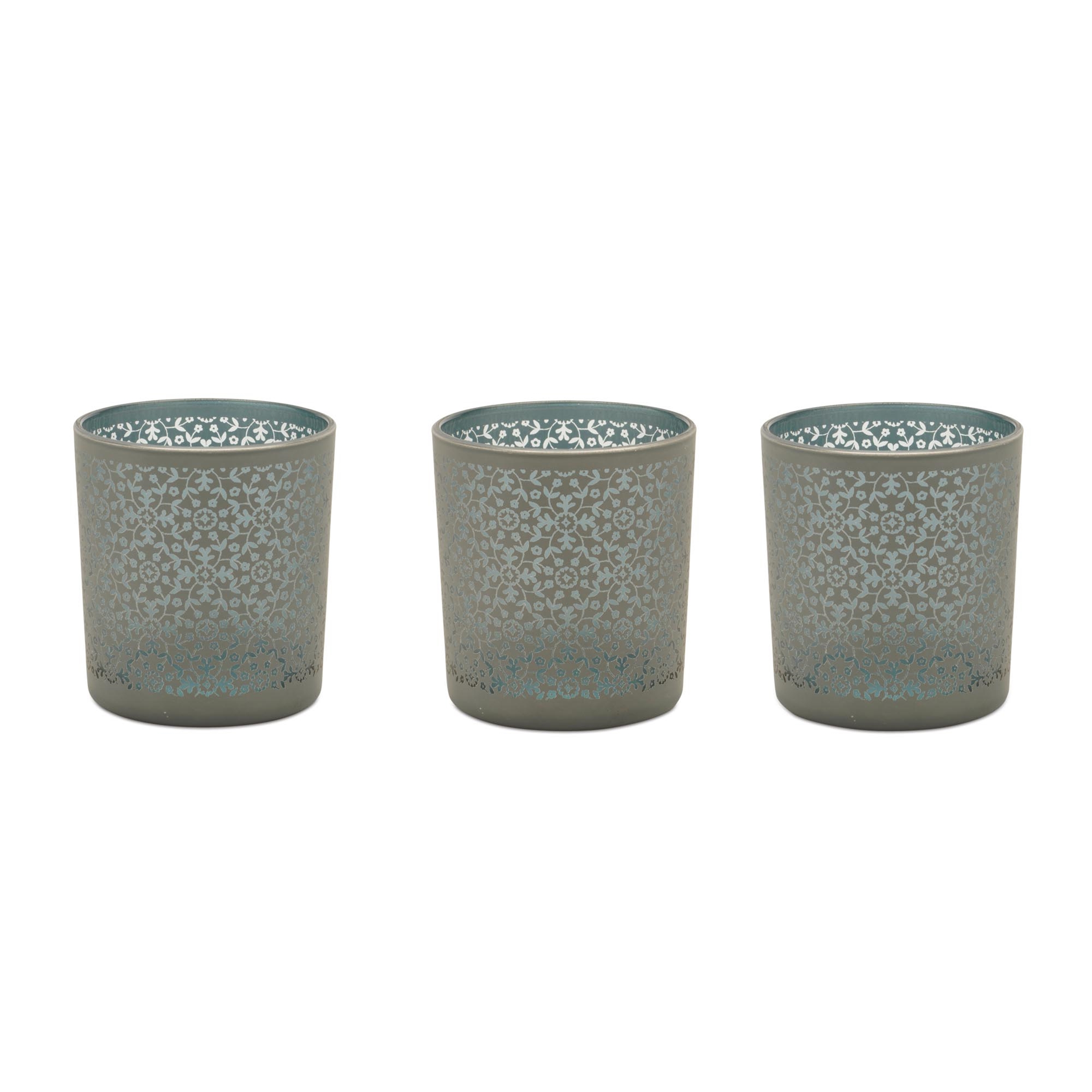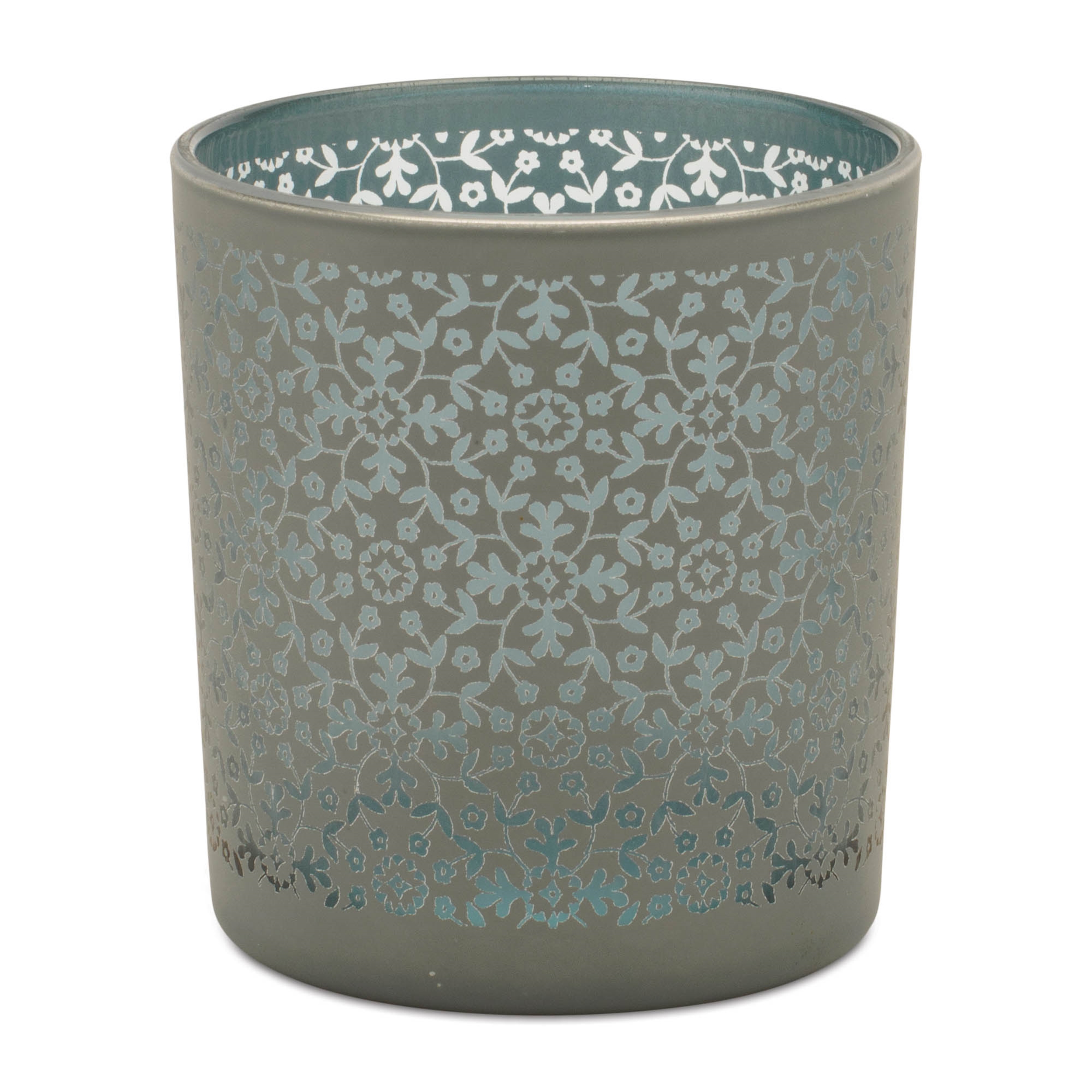 Bring warmth, sophistication, and artistry into your home with this set of patterned candle holders. Crafted from svelte matte silvery-grey glass, these candle holders feature a delicate, repeating floral motif that comes to life when lit. The pattern glows softly by candlelight, casting gentle shadows and adding quiet elegance to evening rituals. Designed to hold standard pillar candles, they offer a graceful blend of texture, light, and form. Each holder features a delicate design that s double-printed on the interior for stunning visual depth. Whether styled on a bookshelf, dining table, or mantel, these holders offer an elegant touch that blends beautifully with modern, contemporary, or eclectic interiors.