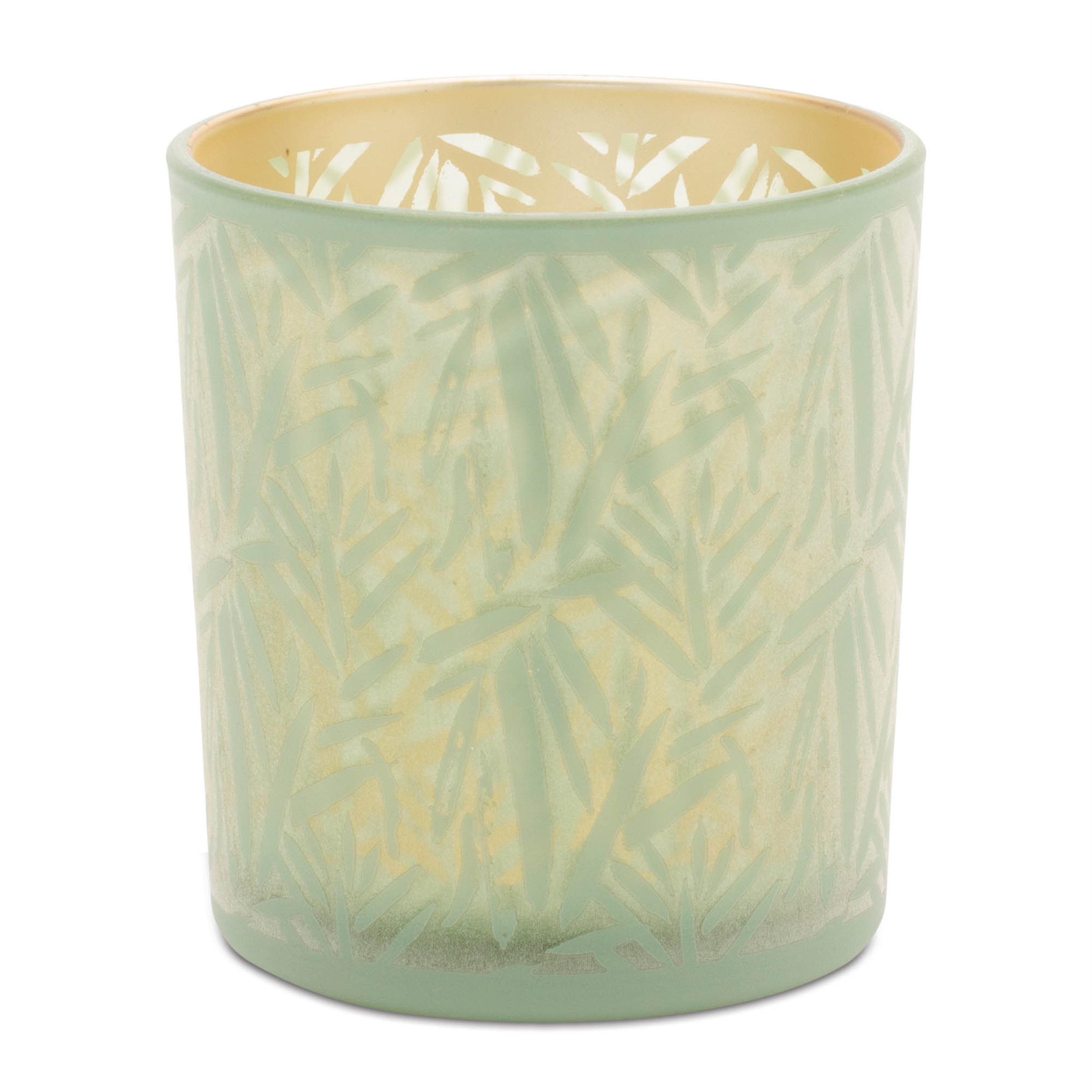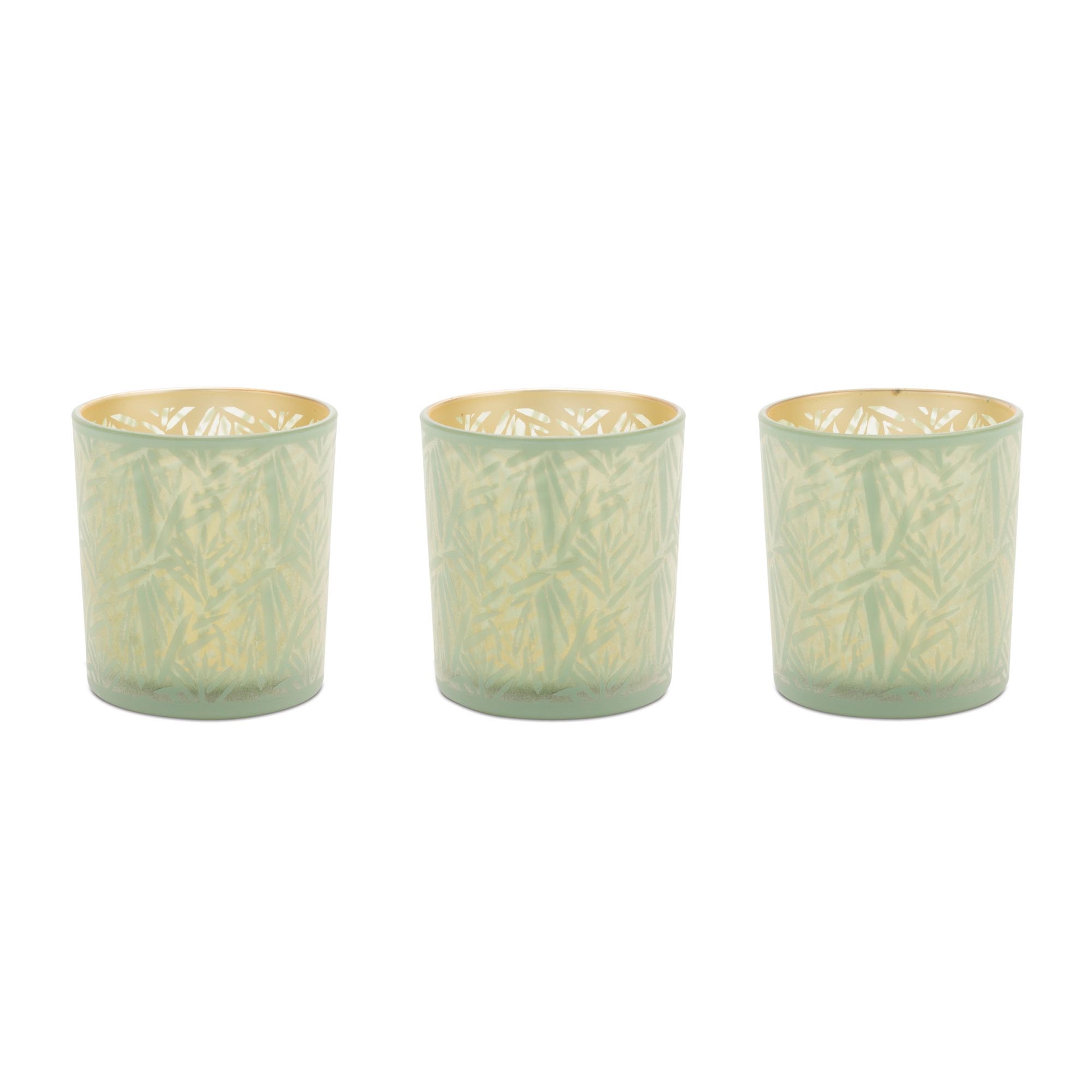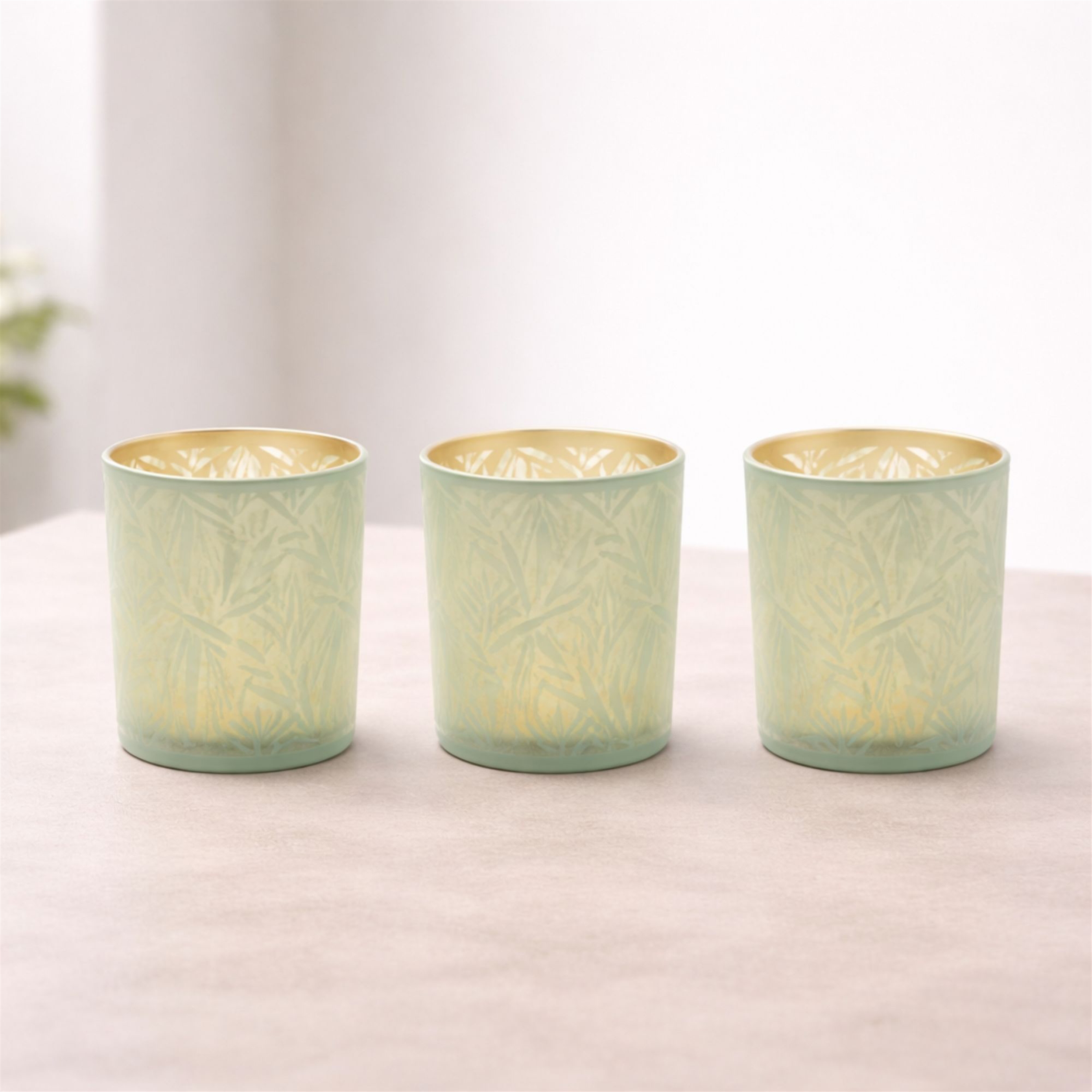 Bring warmth, sophistication, and artistry into your home with this set of botanical votive holders. These candle holders feature a sculptural pattern that is reminiscent of tropical leaves, rendered in a luminous matte finish. Shades of green evoke lush foliage, while metallic gold interiors add a warm, reflective glow. Their presence feels both curated and natural, offering a tranquil glow that complements both botanical or minimalist settings. Each holder features a delicate design that s double-printed on the interior for stunning visual depth. Whether styled on a bookshelf, dining table, or mantel, these holders offer an elegant touch that blends beautifully with modern, contemporary, or eclectic interiors.