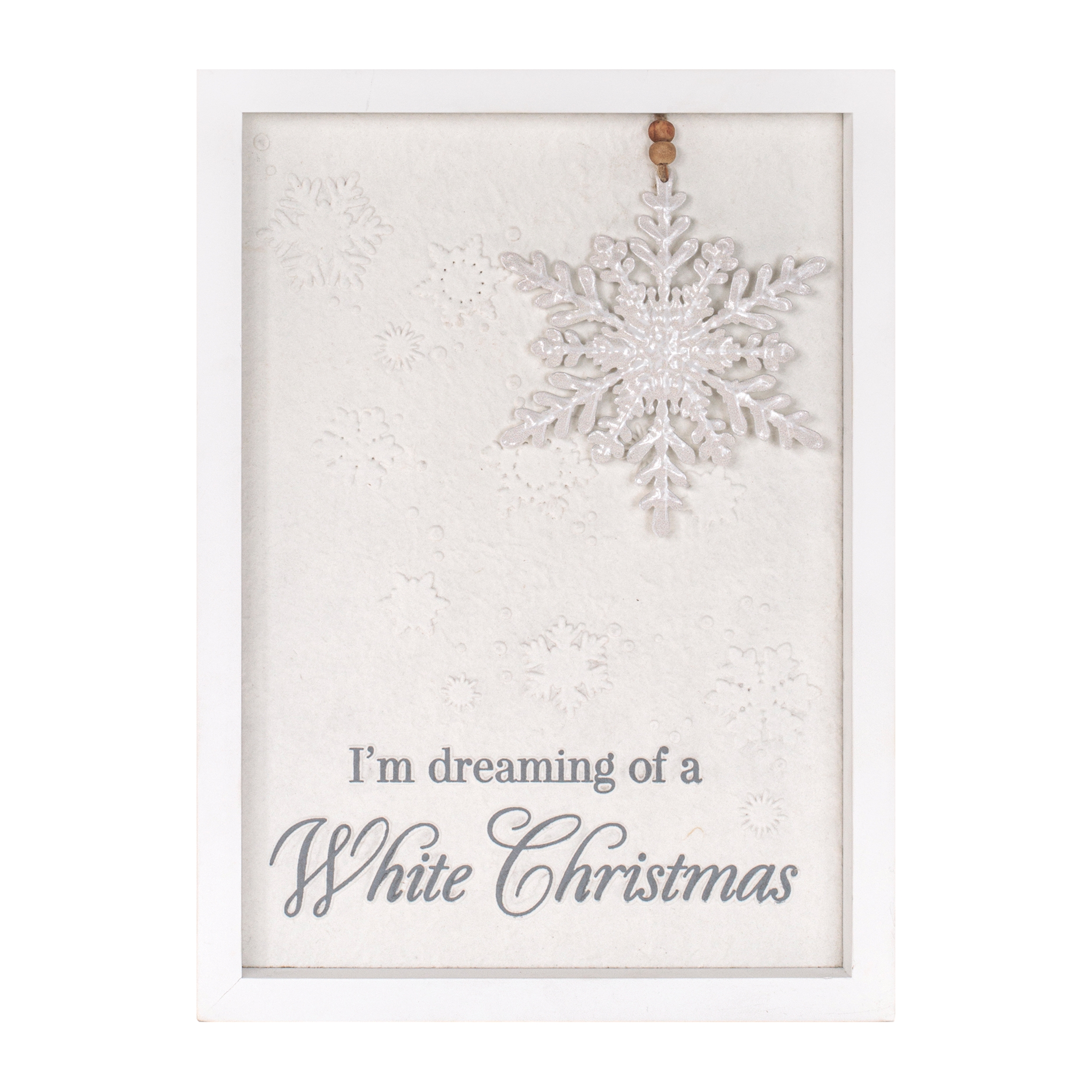 Capture the magic of the season with this Dreaming of a White Christmas snowflake framed sign, a beautifully serene accent for your holiday d cor. Featuring soft neutral tones, delicate snowflake details, and a dimensional hanging snowflake embellishment, this framed wall art brings a peaceful winter charm to any space. The elegant typography paired with the crisp white frame makes it perfect for farmhouse, cottage, or classic Christmas themes. Display it on a mantel, bookshelf, nightstand, or entryway table to create a cozy atmosphere that celebrates snowy days and timeless holiday traditions.