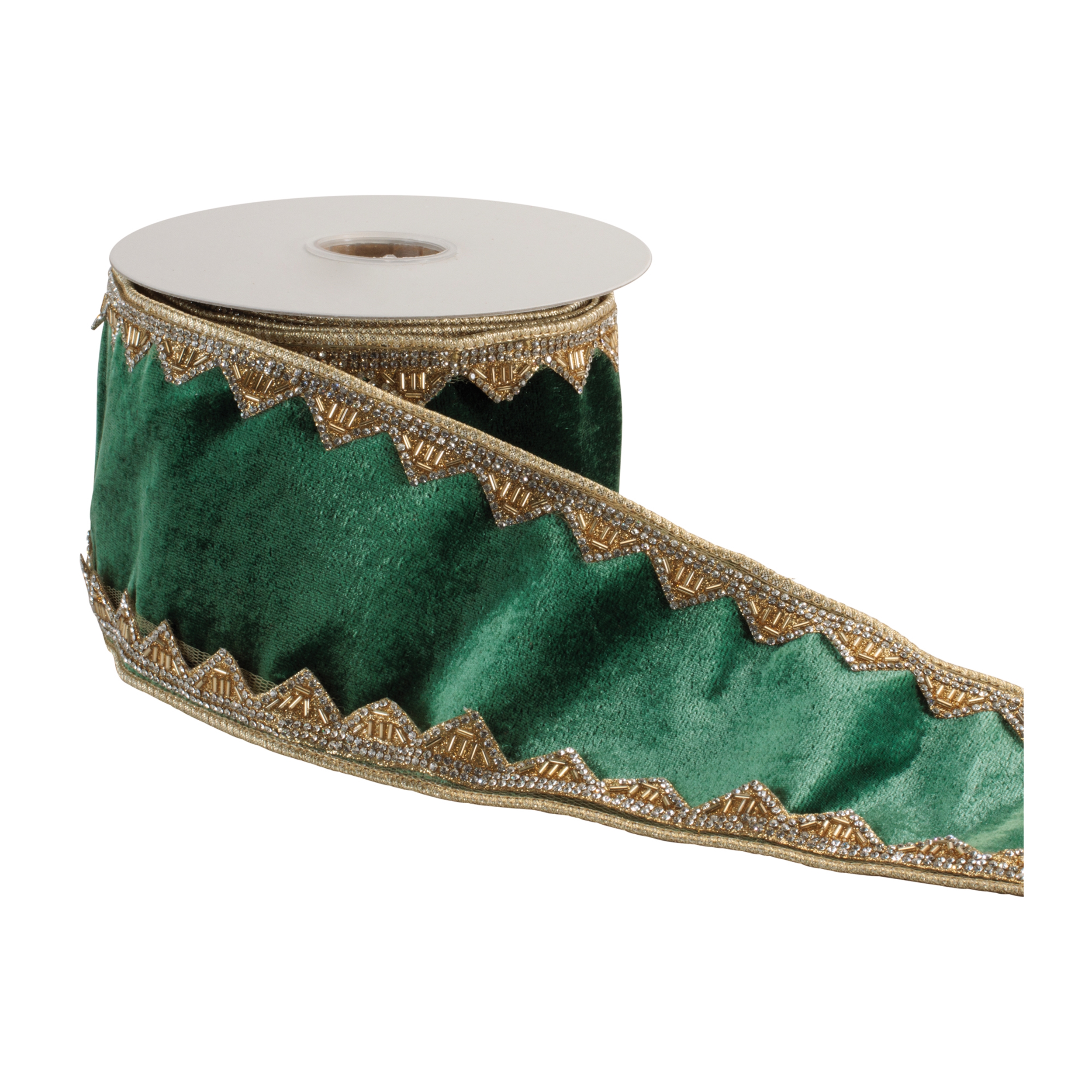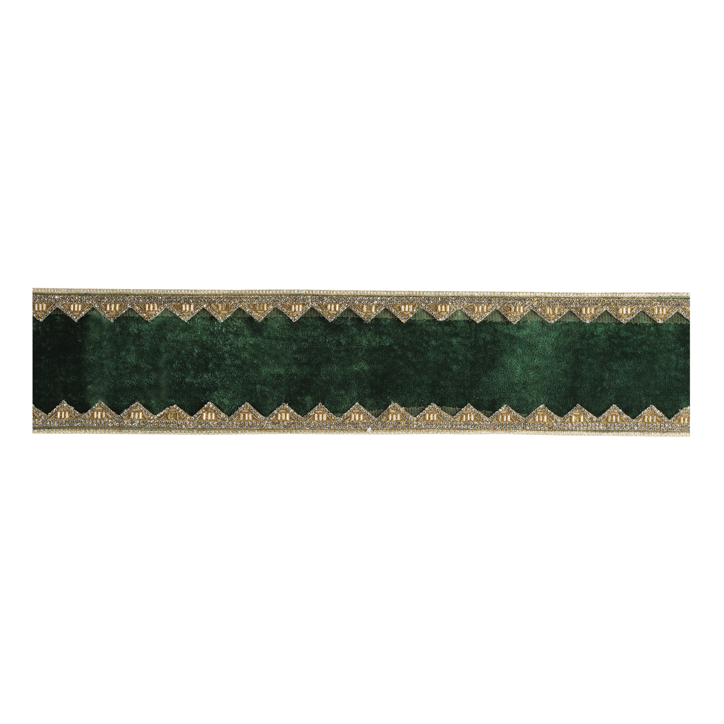 Make a grand statement with this luxurious velvet wired ribbon featuring ornate embellished trim. The rich velvet center is framed with intricate metallic detailing along both edges, creating a regal, heirloom-inspired look that instantly elevates holiday d cor. Perfect for dramatic Christmas tree bows, wreath accents, garlands, and elegant mantel displays, this ribbon adds depth, texture, and shimmering dimension to any setting. Its generous 4-inch width makes it ideal for crafting full, structured bows and cascading designs, whether you're decorating for the holidays, styling a formal event, or creating upscale gift presentations.