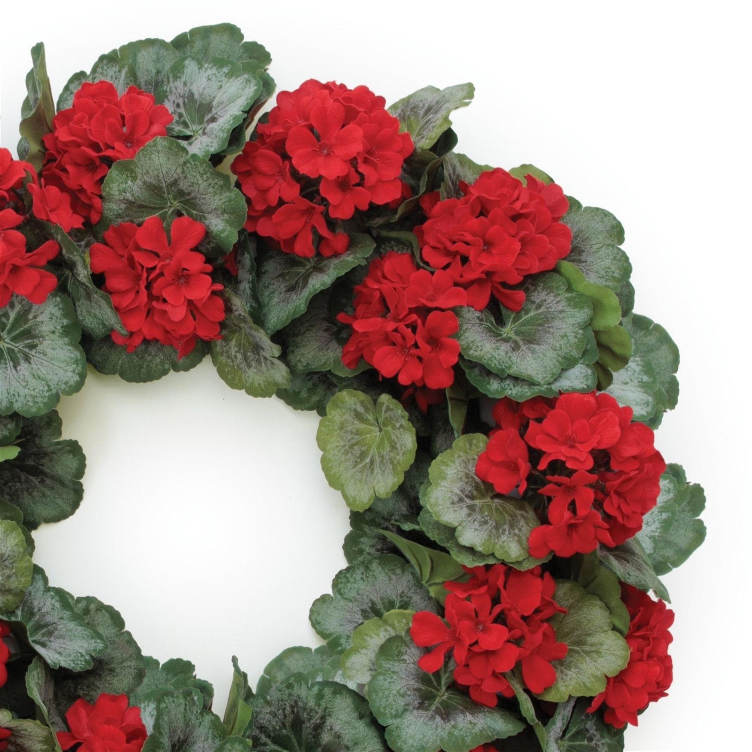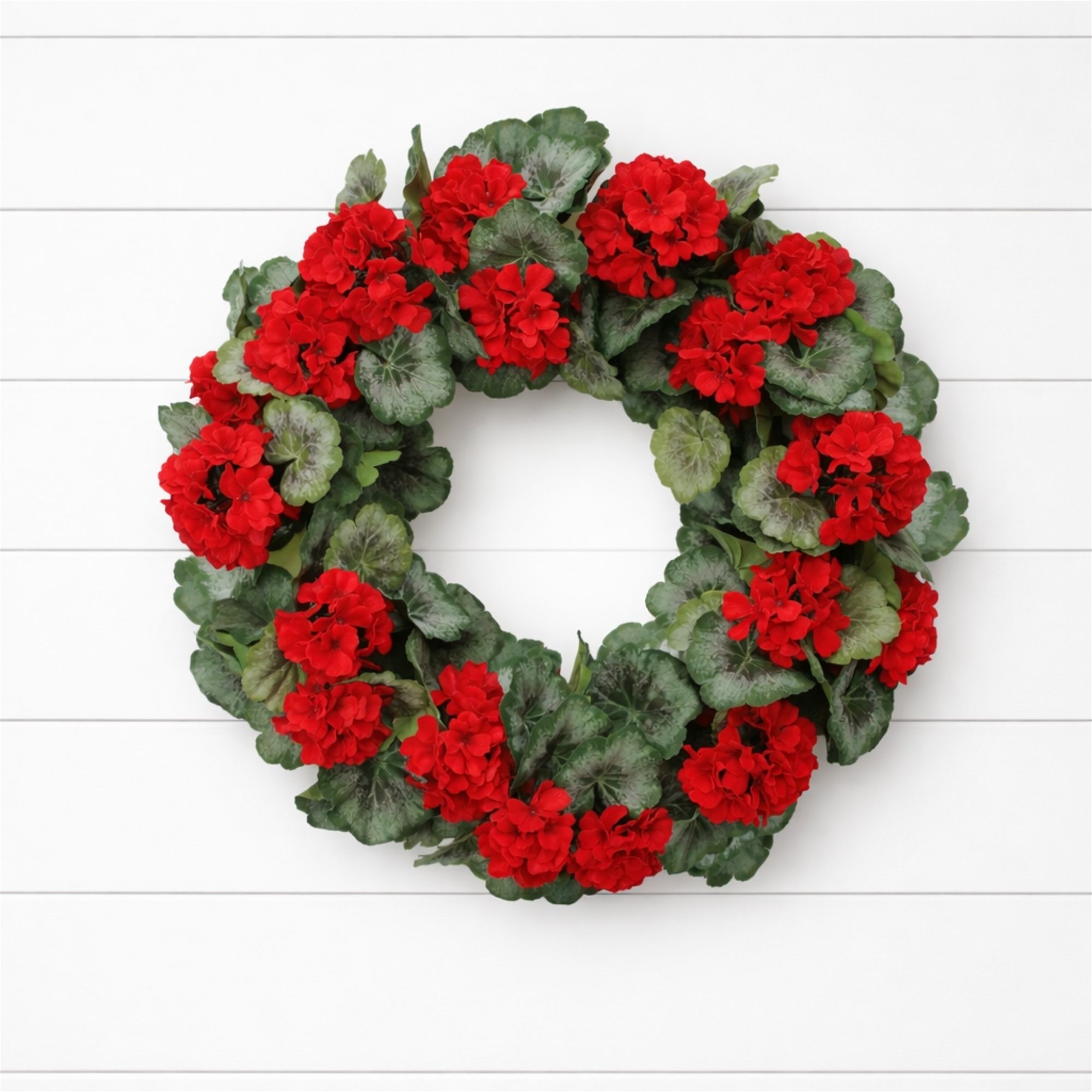 Brighten your space with the vibrant charm of this Red Geranium Wreath. Featuring lush clusters of bold red geranium blooms paired with rich green foliage, this wreath brings a fresh, garden-inspired look to your decor. The full, layered design creates a welcoming statement, perfect for doors, walls, or seasonal displays. Crafted for lasting beauty, it offers the look of fresh florals without any maintenance.