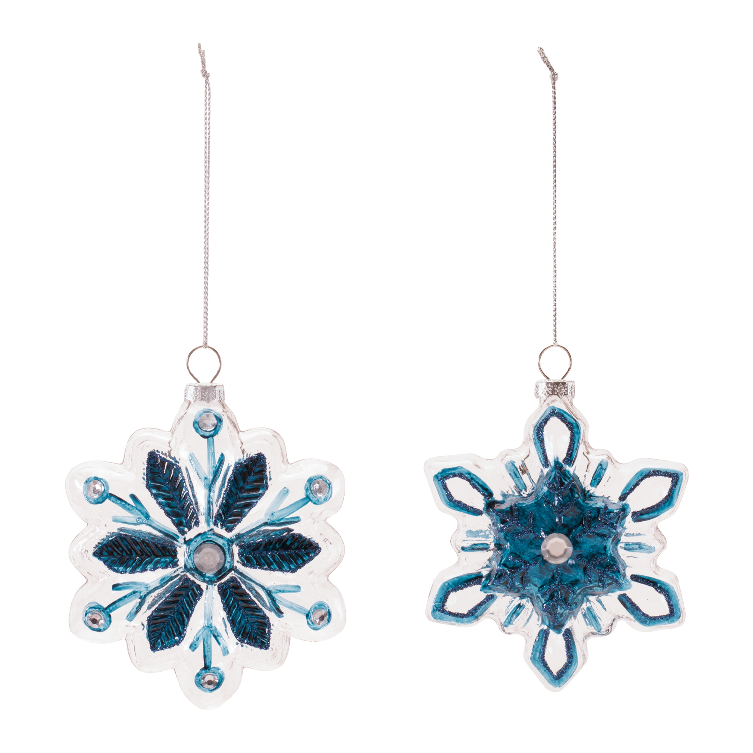 Celebrate the beauty of winter with this set of Glass Snowflake Ornaments. Each 4-inch ornament features an intricate snowflake design crafted from glossy glass, perfectly reflecting holiday lights for a sparkling, festive display. Ideal for adding a touch of seasonal elegance to your Christmas tree, garlands, wreaths, or tabletop d cor.