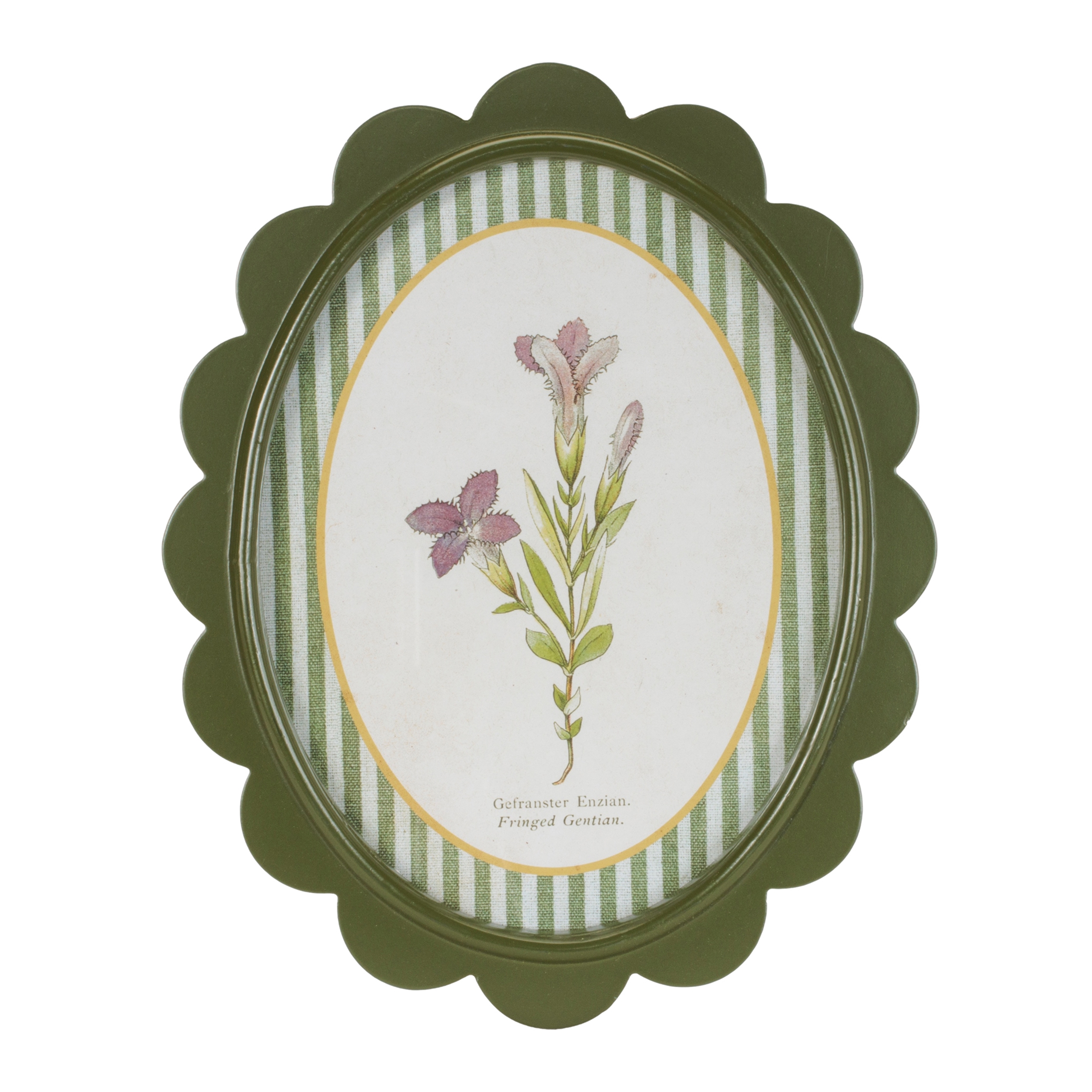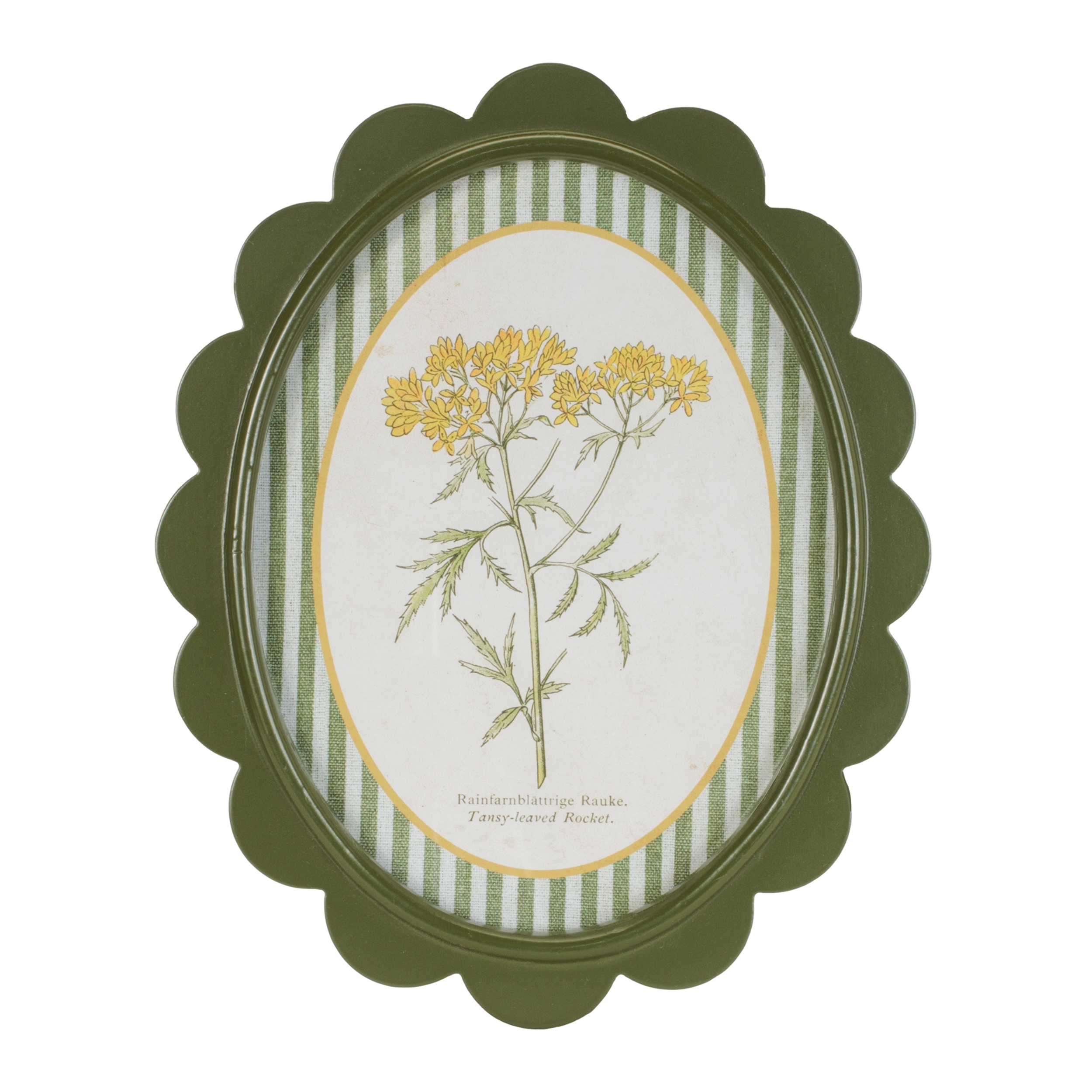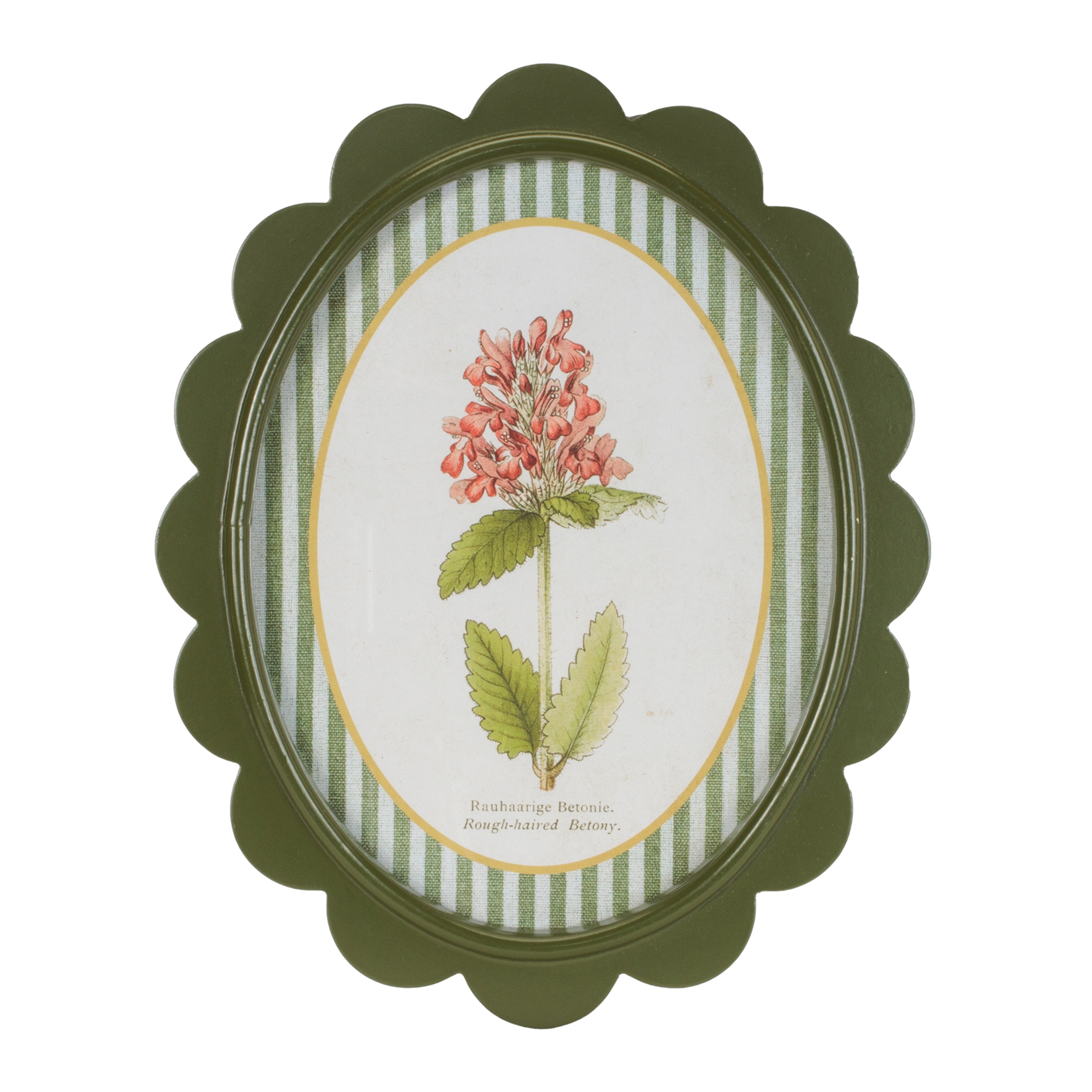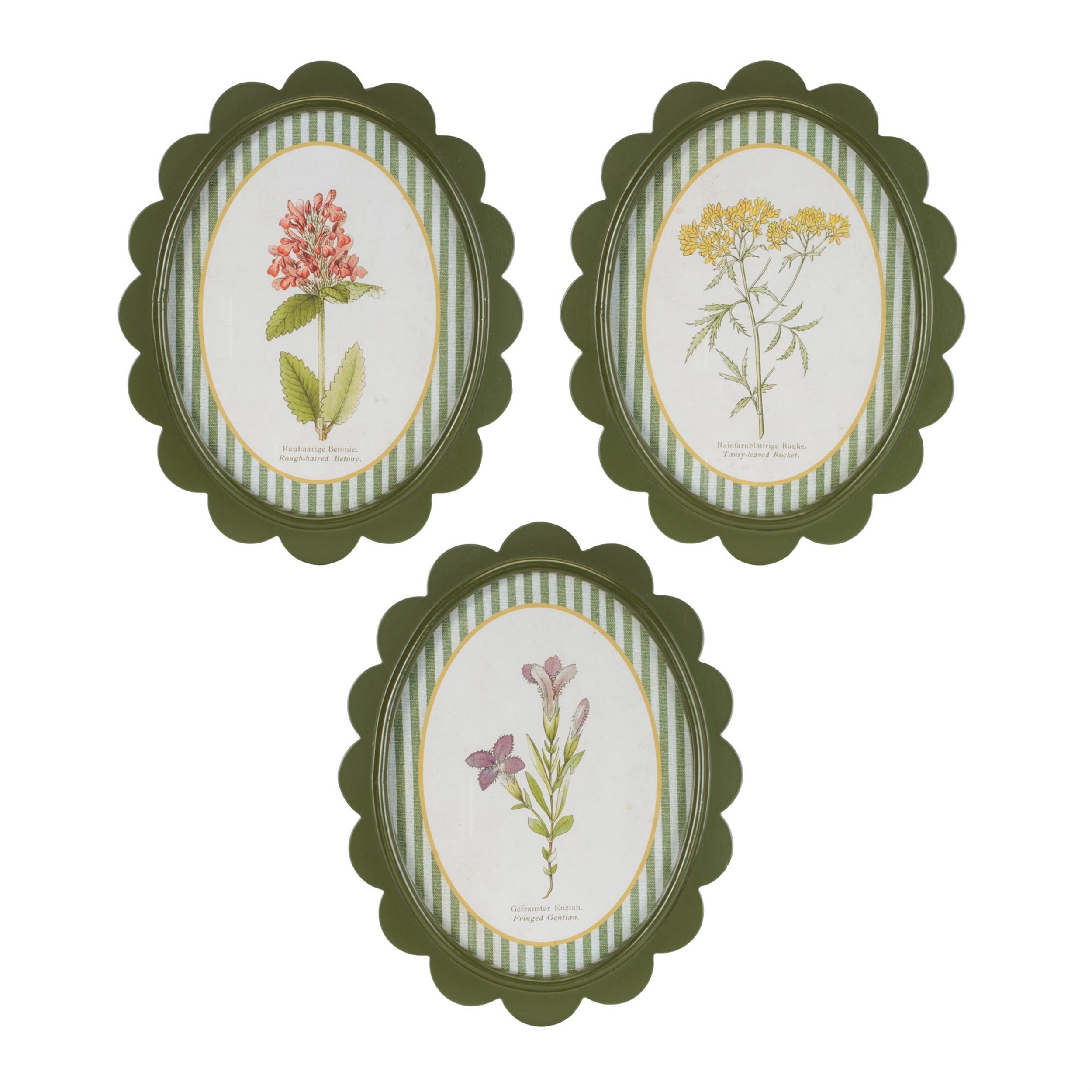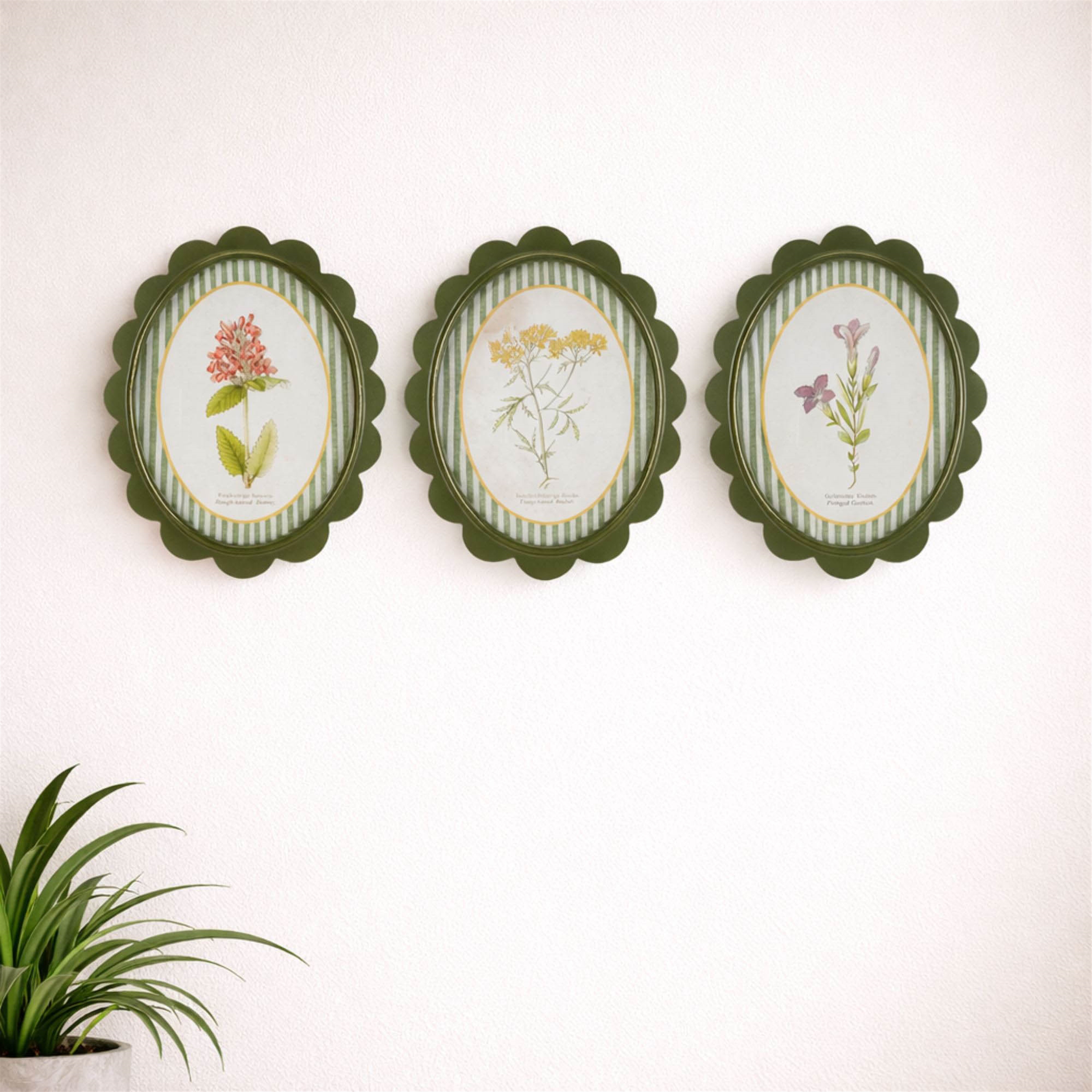 Bring charming garden nostalgia to your walls with the Framed Encyclopedia Flower Print Set. Inspired by vintage botanical textbook illustrations, these delightful floral prints feature delicate blooms framed in scalloped olive-green borders with striped detailing for a fresh, collected look. Perfect for cottage, farmhouse, traditional, or eclectic interiors, this set of three adds a soft pop of nature-inspired color to kitchens, bedrooms, hallways, or gallery walls. With their antique encyclopedia style and whimsical frame shape, these pieces feel like timeless treasures from a curated herbarium.
