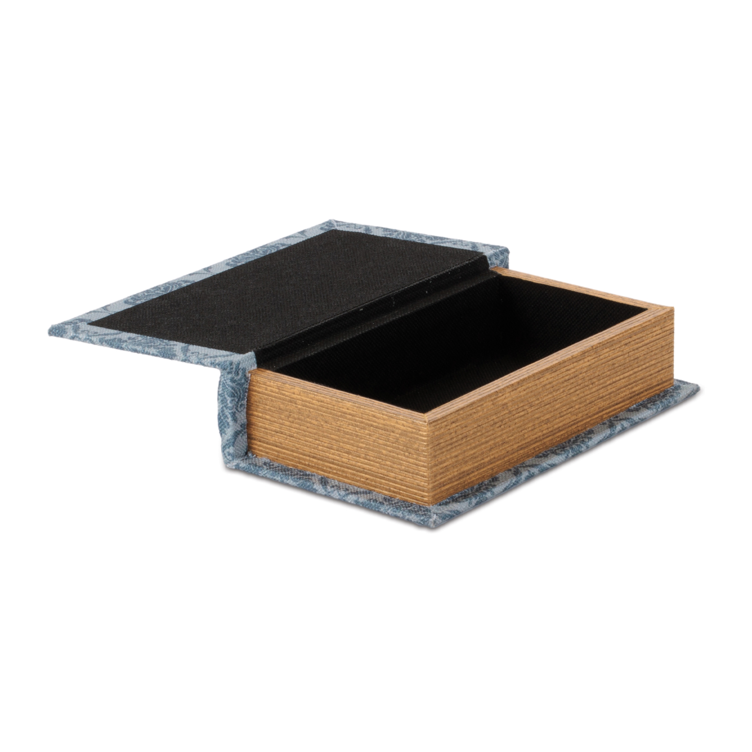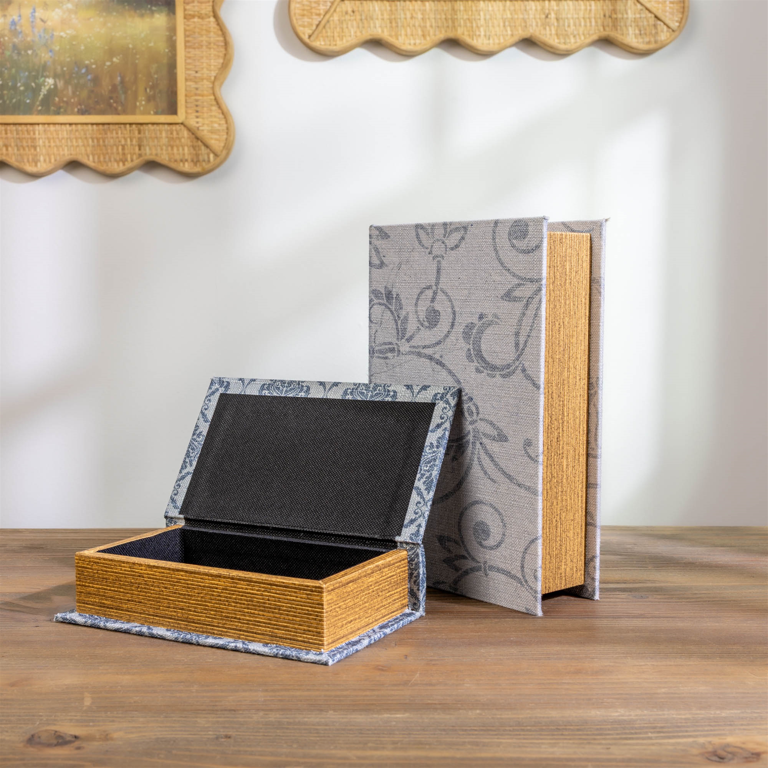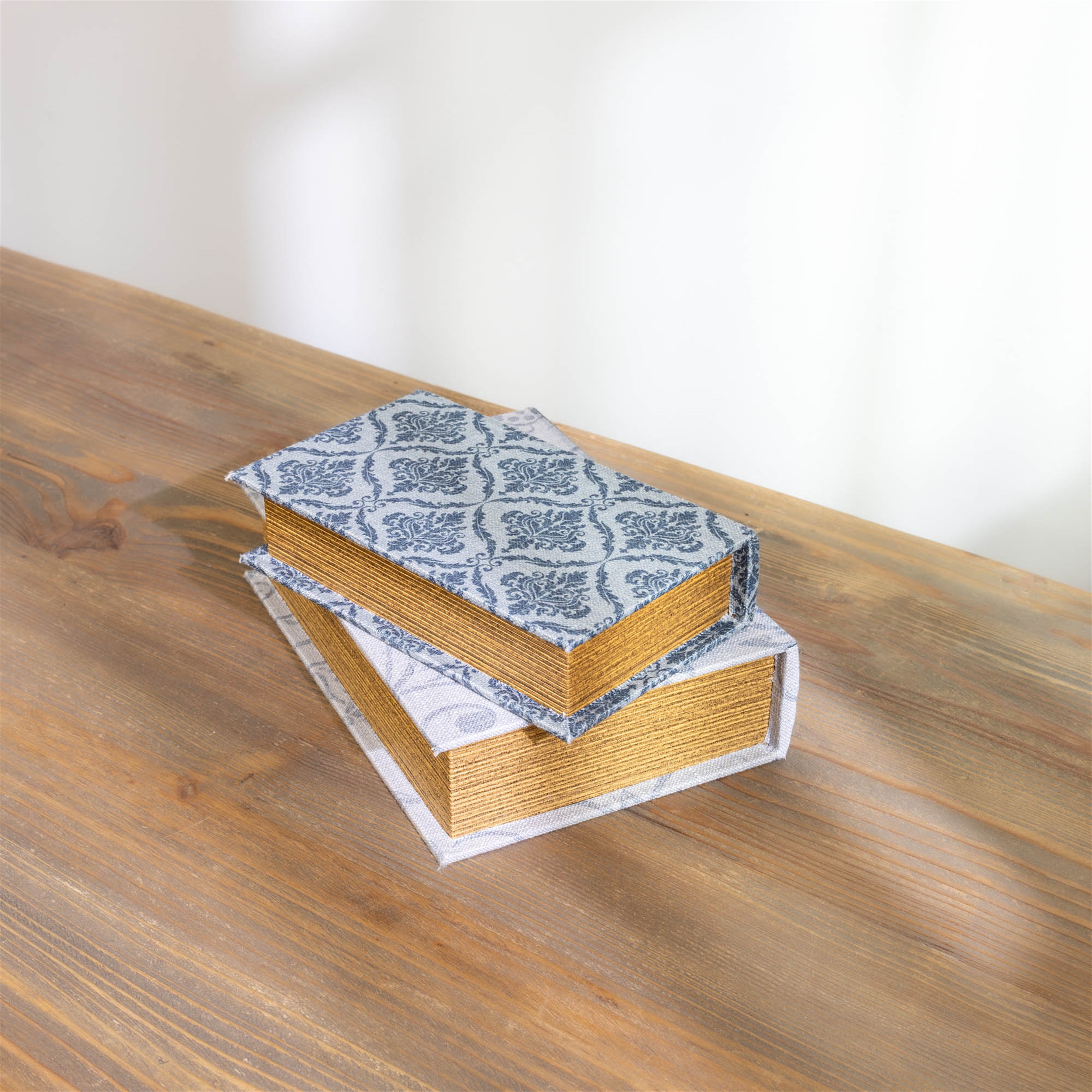 Hide your treasures in plain sight with this stylish Patterned Decorative Book Box set. Designed to look like classic hardcover books, these storage boxes feature soft blue fabric covers with elegant scroll and medallion-inspired patterns, along with realistic page detailing for an authentic touch. Perfect for storing remotes, keepsakes, jewelry, office supplies, or small accessories, they blend seamlessly into bookshelves, coffee tables, consoles, and home offices. Functional and decorative, this faux book storage set adds charm, organization, and a timeless layered look to any space.