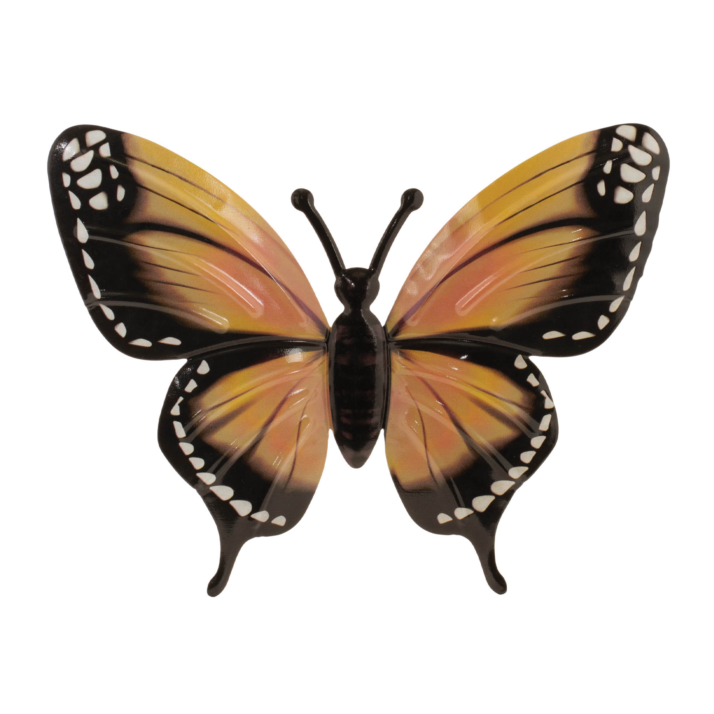 Brighten your indoor or outdoor space with this Colorful Metal Butterfly Wall D cor Set. Crafted from durable iron and finished in vibrant hues, each butterfly features detailed wing patterns and dimensional shaping for lifelike appeal. Designed in three varying sizes, these decorative accents create eye-catching movement and charm when displayed together on a wall, fence, or patio. Perfect for garden-inspired, farmhouse, or eclectic d cor styles, this trio adds a cheerful pop of color to any setting.