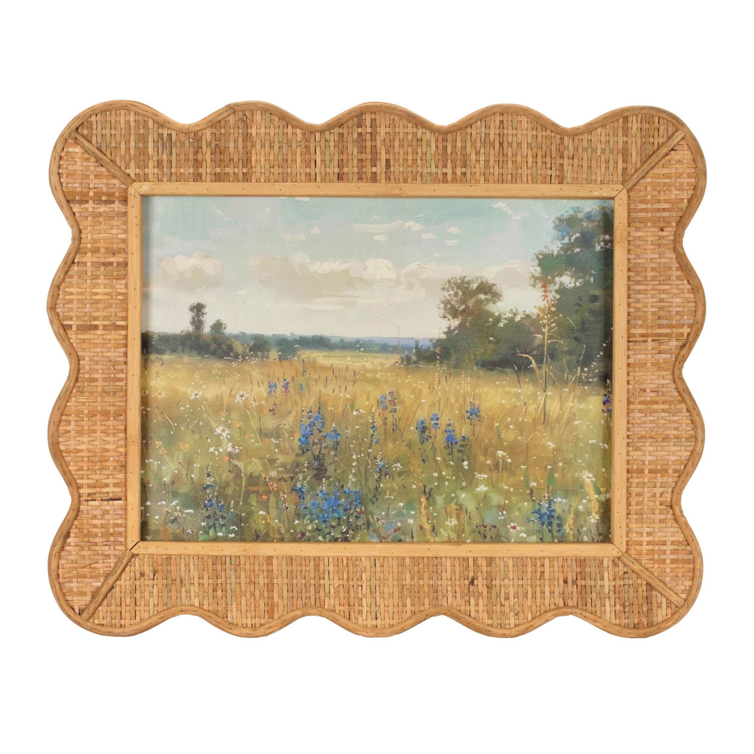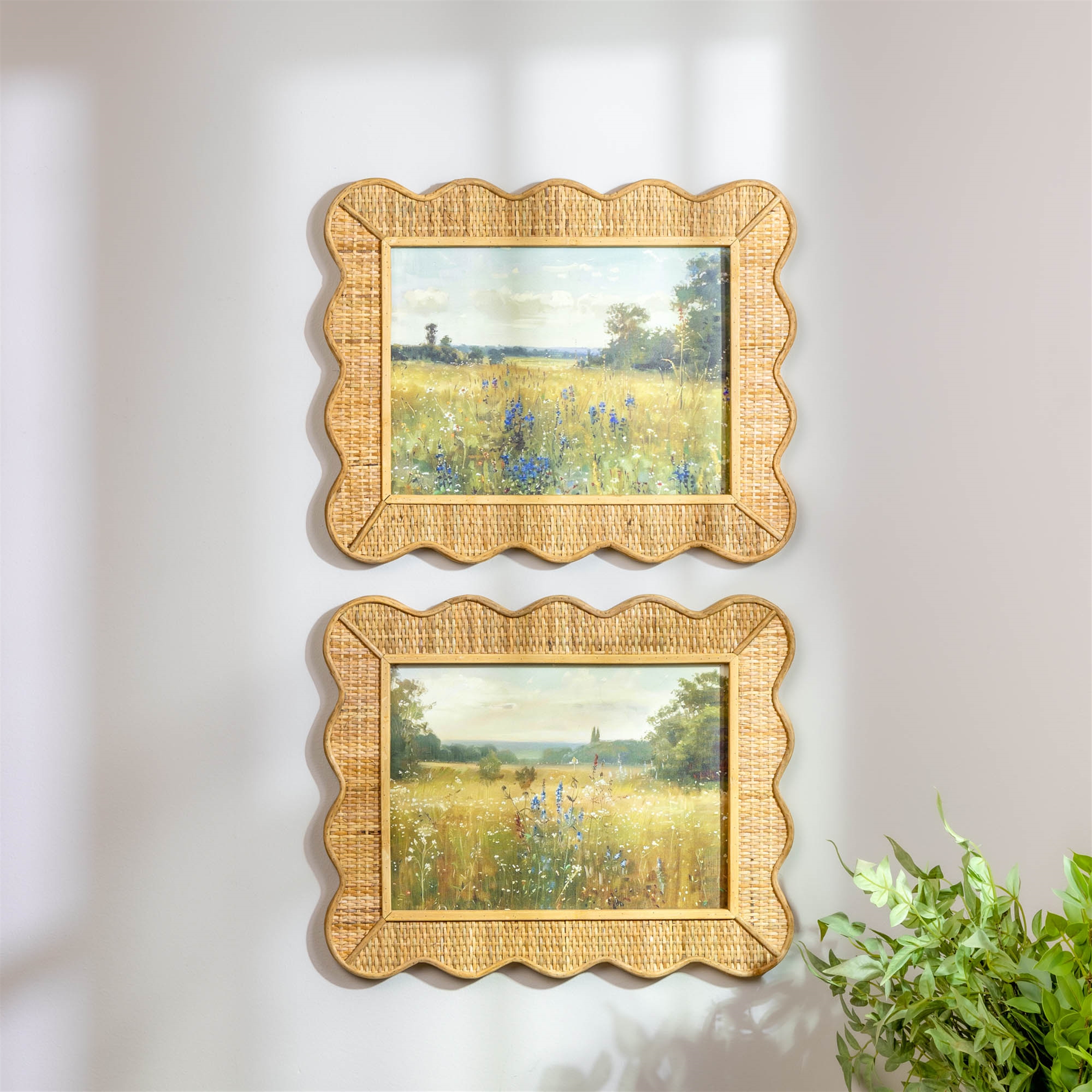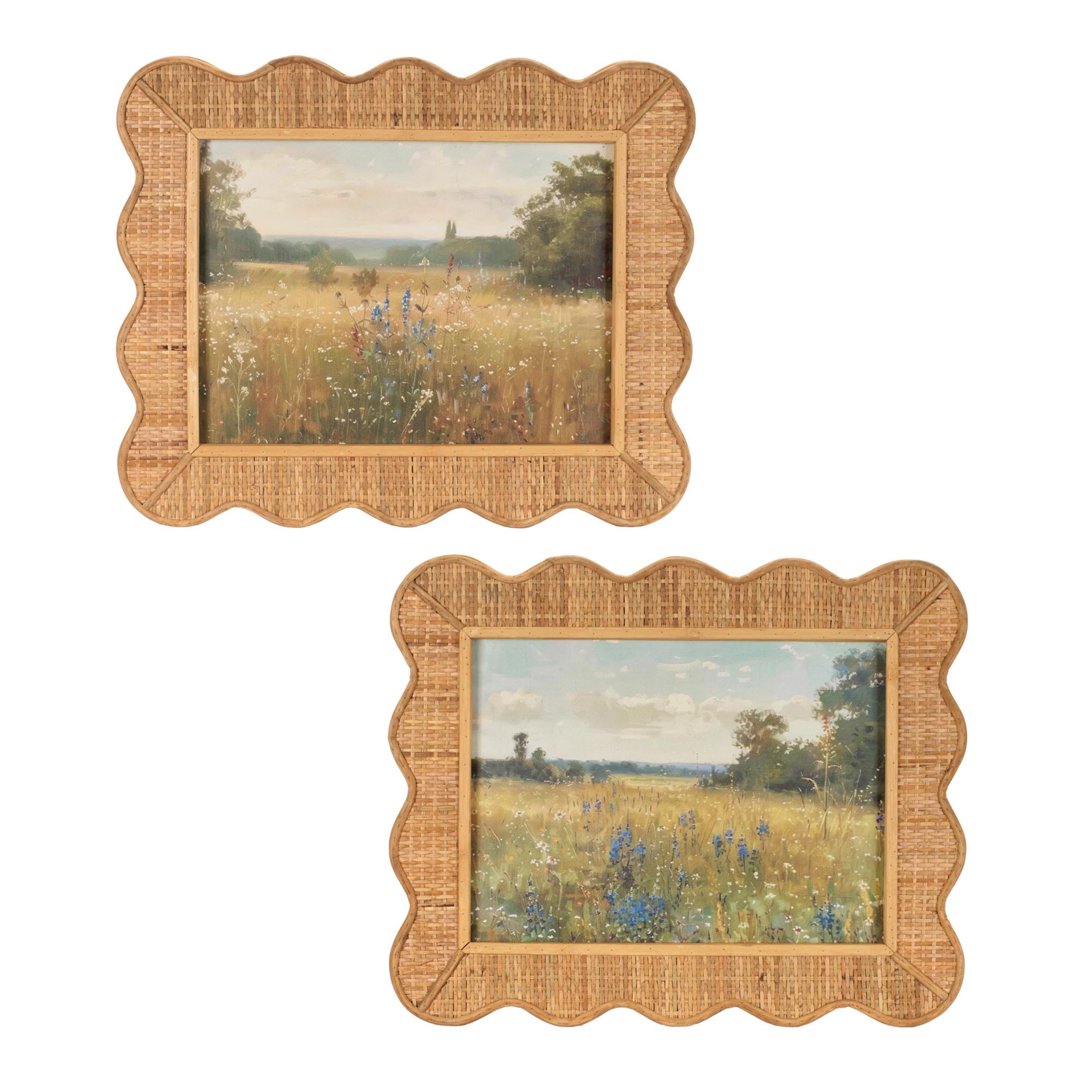 Bring a warm and inviting touch to your space with this framed landscape print set, featuring serene meadow scenes with soft, painterly details. Each artwork is beautifully complemented by a woven bamboo-style frame with a gently scalloped edge, adding texture and natural charm. Perfect for living rooms, bedrooms, or entryways, this set creates a relaxed, nature-inspired atmosphere with an artisanal feel.
