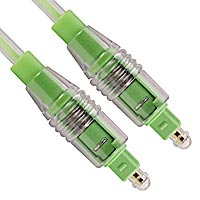 Toslink plugs on both ends of a 5mm green colored plastic fiber cable.