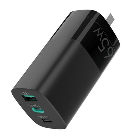 65W GAN PD CHARGER 2 X USB-C 1 X USB-A BLACK