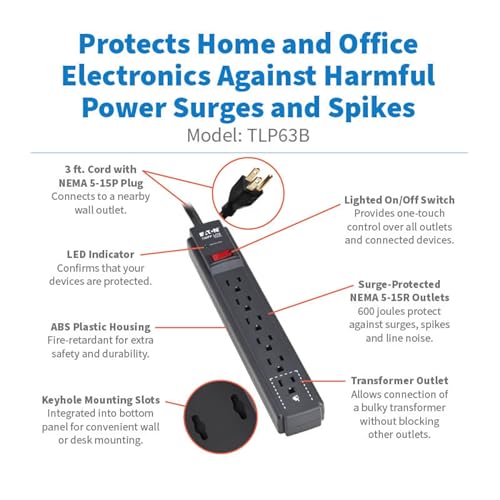 Eaton TLP63B 6-OUTLET SURGE PROTECTOR 5-15R OUTLETS 3 FT. (0.9 M) CORD BLACK