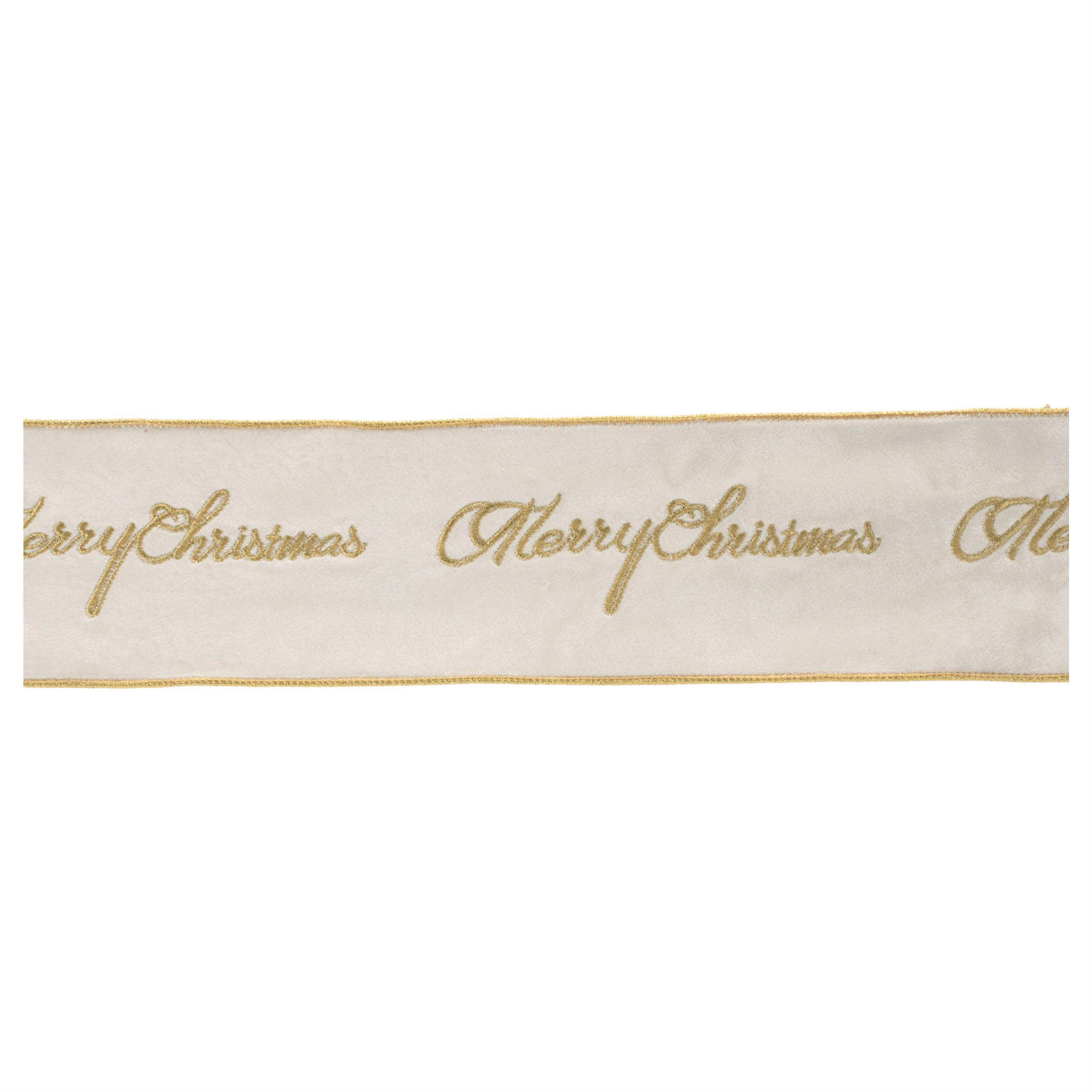 Celebrate the season with elegance using this embroidered "Merry Christmas" wired ribbon. Featuring a wintry white tone with chic gold trim and embroidered cursive "Merry Christmas" script, this ribbon adds a sophisticated and festive touch to your holiday projects. Measuring 4" wide and 5 yards long, it s wired for easy shaping and secure displays. Perfect for holiday arrangements, gift wrapping, and crafts, this ribbon brings a warm and stylish message to your festive decor.
