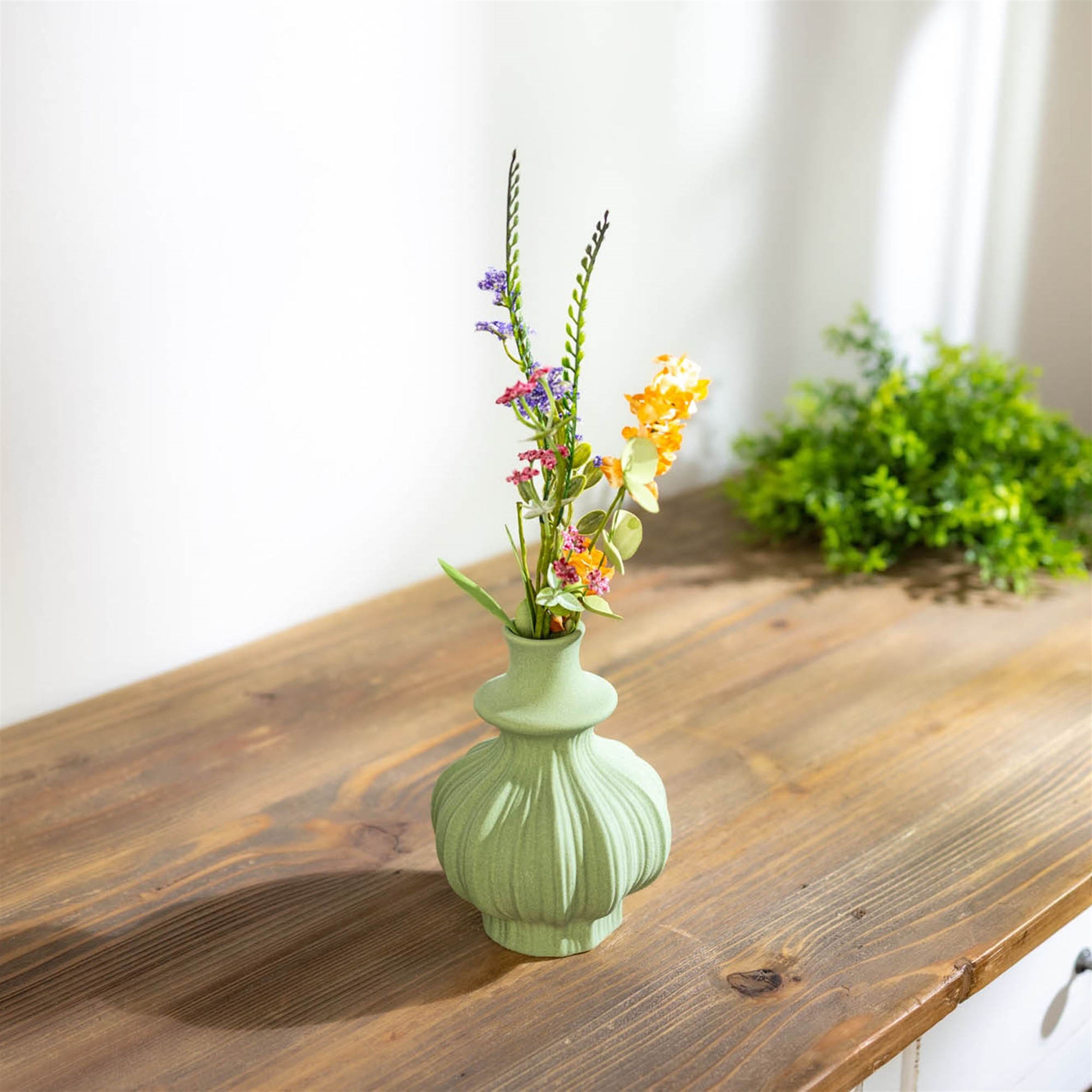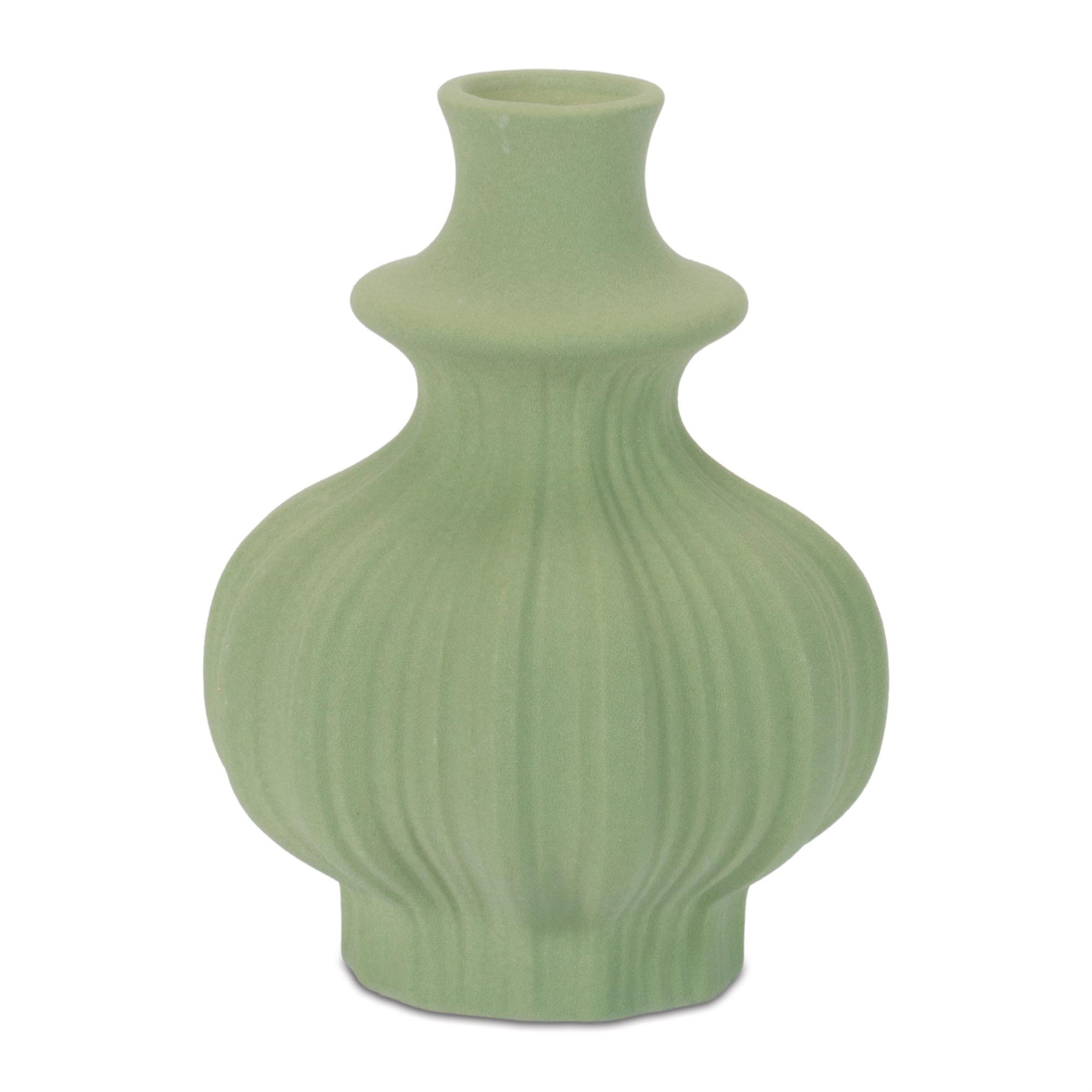 Refresh your space with the soft, modern elegance of this Ribbed Green Stoneware Vase Set. Featuring a calming sage green finish and sculpted ribbed texture along the body, these decorative containers blend clean lines with organic curves for a timeless look. The tiered neck detail adds architectural interest, making each piece a subtle statement on its own. Perfect for styling with fresh flowers, dried botanicals, or faux stems, these vases also shine as standalone accents on consoles, shelves, dining tables, or entryway displays. Whether your d cor leans modern, Scandinavian, farmhouse, or transitional, this stoneware vase set adds soothing color and refined texture to any room.