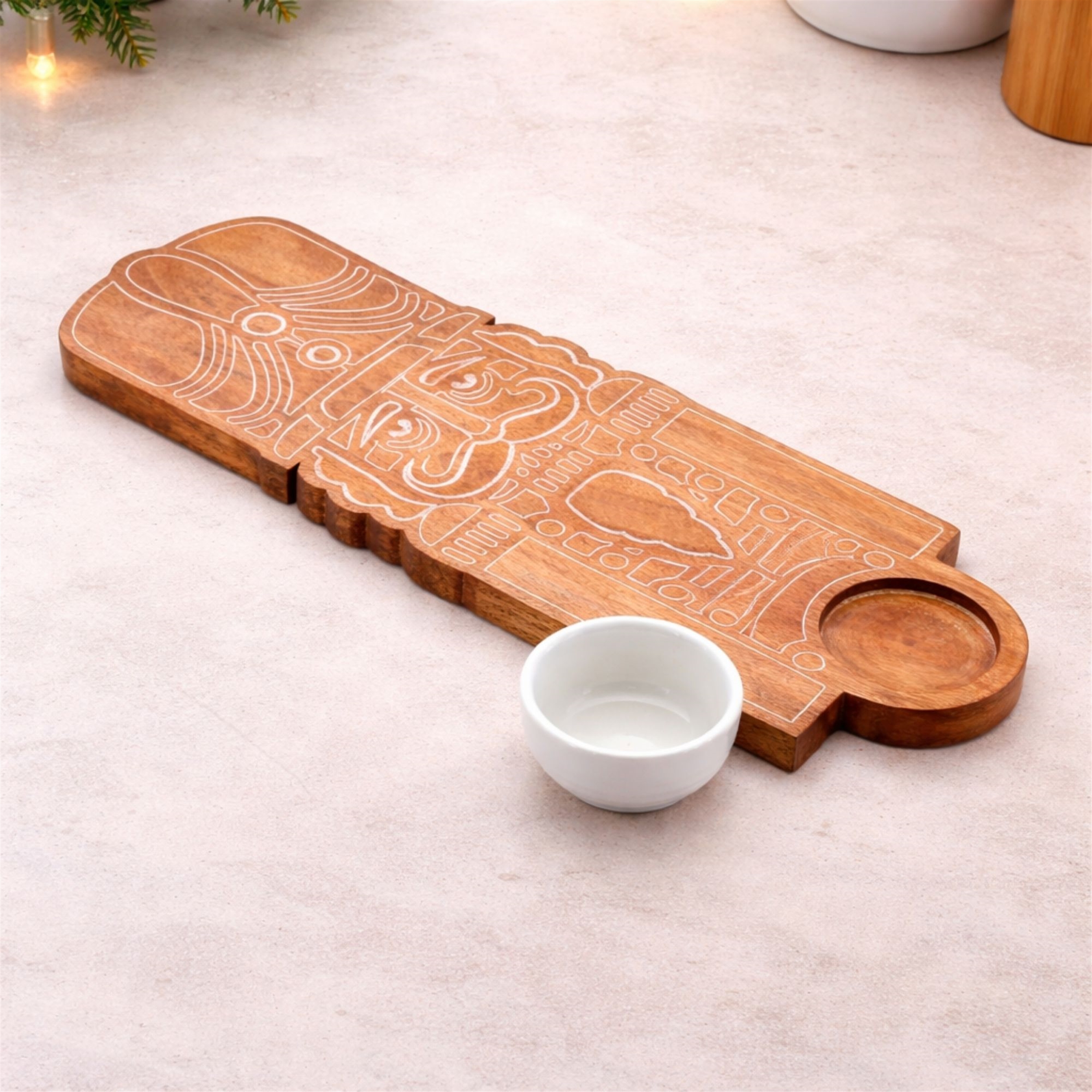 Serve your holiday favorites in festive style with this Nutcracker Wood Platter with Ceramic Dip Bowl. Featuring a beautifully engraved nutcracker design etched into warm natural wood, this serving board captures the timeless charm of classic Christmas d cor. The attached ceramic dip bowl makes it perfect for pairing crackers and cheese, cookies and icing, veggies and dip, or chips and salsa during holiday parties and family gatherings. Its elongated shape is ideal for entertaining, while the detailed nutcracker artwork makes it just as stunning displayed on a buffet table or kitchen counter. Whether you're hosting a Christmas celebration or looking for a unique seasonal gift, this nutcracker platter adds a touch of traditional holiday magic to every spread.