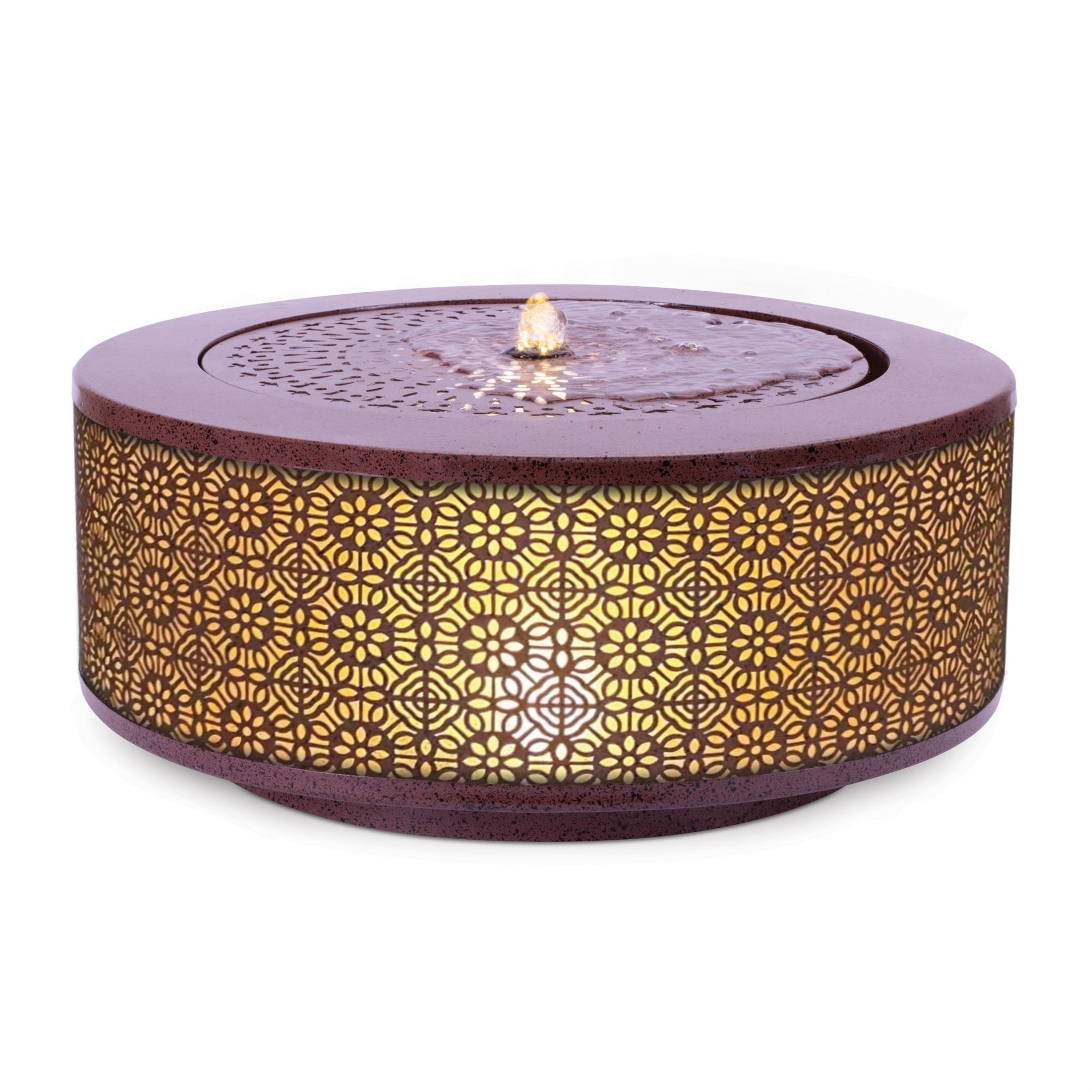 Create a relaxing atmosphere with this Illuminated Round Tabletop Fountain. Featuring a decorative patterned metal base with a soft internal glow, this fountain combines flowing water and warm light to create a calming focal point. The gently bubbling water adds soothing sound while the intricate cutout design casts a beautiful ambient glow, making it perfect for patios, tabletops, entryways, or indoor relaxation spaces.