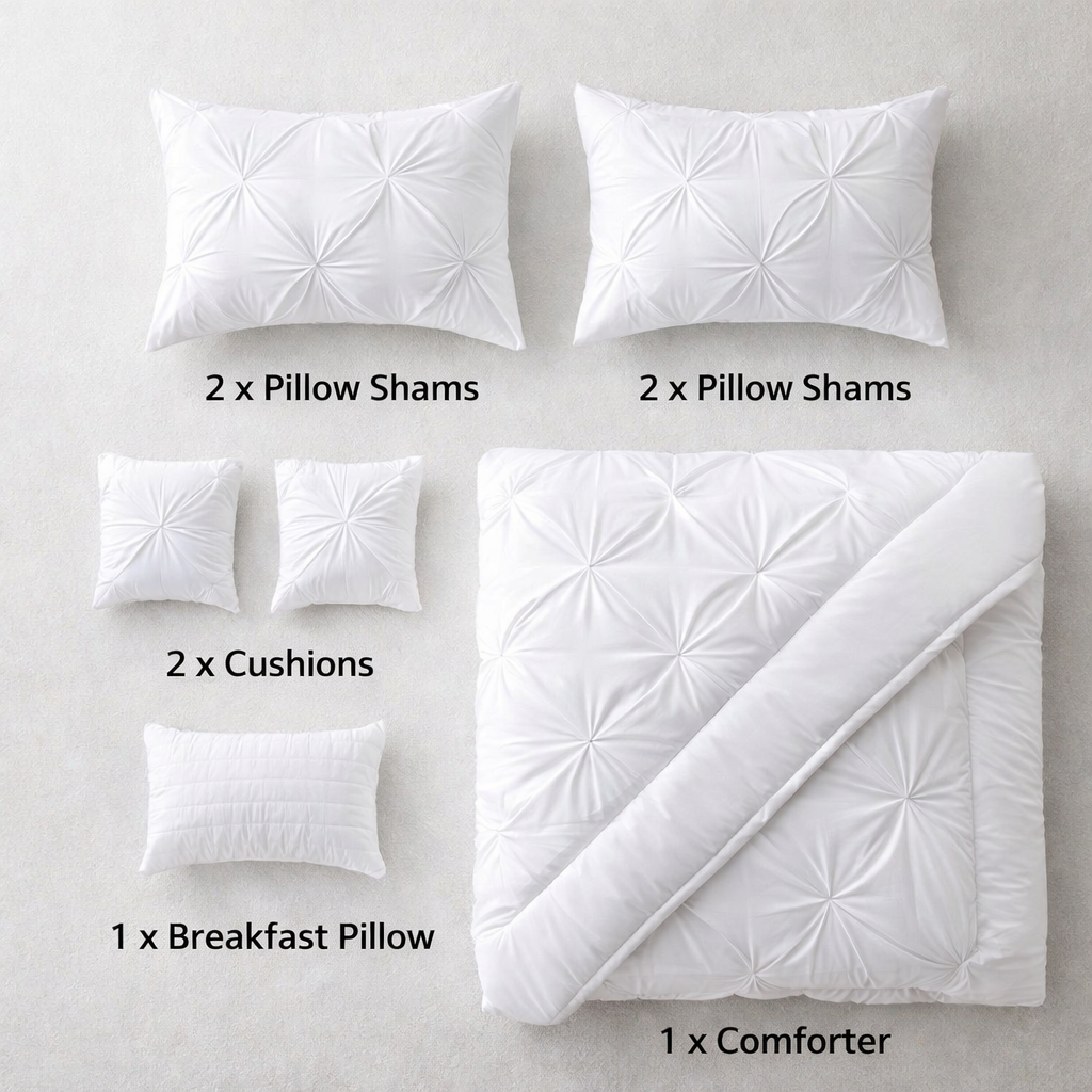 White Comforter SetUltra Soft and Cozy: Our Premium comforters are everything you need for a dreamy night’s sleep. With a luxurious breathable Microfiber filling, it is truly for all seasons. Enjoy feeling warm and snug on a chilly evening while still feeling just right the rest of the year. Durable - The patterned comforter is highly durable with a high tensile strength, making it strong and less likely to rip or tear. 100% microfiber, soft, durable, lightweight, fade-resistant, wrinkle-resistant, hypoallergenic and machine washable. Design: Pintuck Color: White Sizes: Queen and King Size 6 piece set Dimensions: