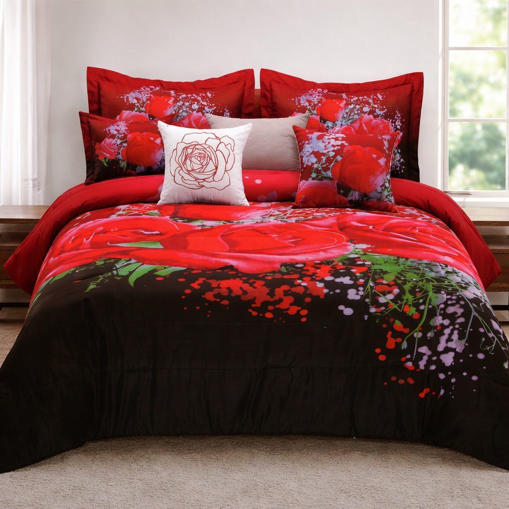 Floral Comforter SetUltra Soft and Cozy: Our Premium comforters are everything you need for a dreamy night’s sleep. With a luxurious breathable Microfiber filling, it is truly for all seasons. Enjoy feeling warm and snug on a chilly evening while still feeling just right the rest of the year. Durable - The patterned comforter is highly durable with a high tensile strength, making it strong and less likely to rip or tear. 100% microfiber, soft, durable, lightweight, fade-resistant, wrinkle-resistant, hypoallergenic and machine washable. Design: Floral - Red Roses Color: Multicolor Sizes: Queen and King Size 7 piece set Dimensions: