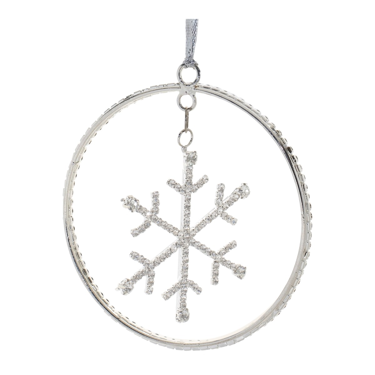 Bring glamorous holiday cheer to your tree with the Jeweled Metal Hanging Snowflake Ornament. Featuring festive silver tones, this ornament displays a traditional snowflake design encased within a sleek disc shape, accented with chic glass jewel details. The delicate metallic string hanger ensures effortless display. Sold in a set of 12 matching pieces, these ornaments are perfect for enhancing your Christmas decor or gifting to spread the beauty of the season.