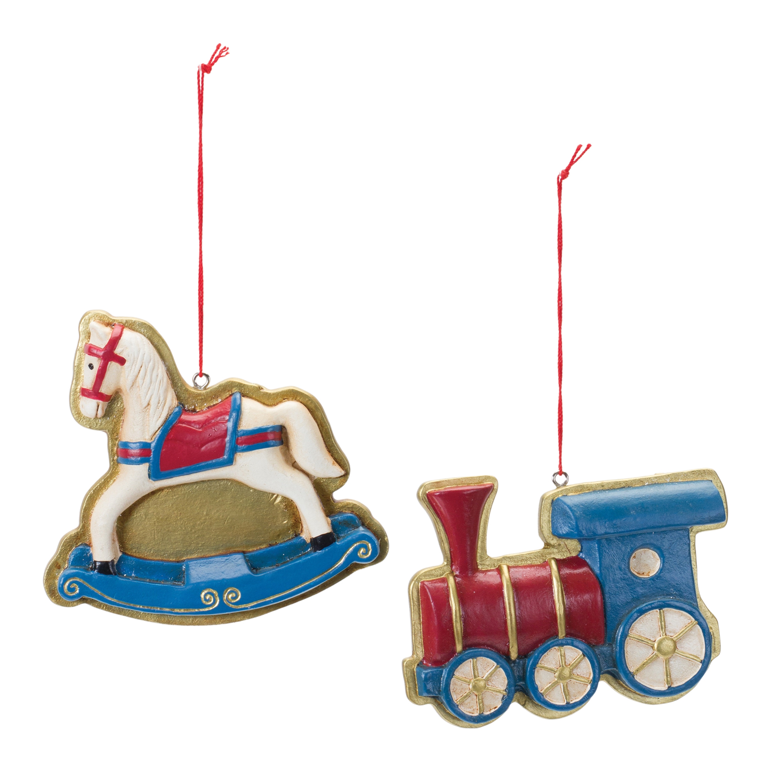 Add a whimsical touch to your holiday decor with the Rocking Horse and Toy Train Ornament Set. Featuring charming ornaments, each adorned with bright red, blue, and gold accents, this set combines vintage-inspired rocking horse and toy train designs. Crafted from durable recycled paper and plaster, these ornaments come with a string hanger for easy display. Perfect for adding festive cheer to your Christmas tree or as a thoughtful gift for someone special, these ornaments will create lasting memories season after season. Sold in a set of twelve pieces with two assorted designs to create a balanced display on your Christmas Tree.